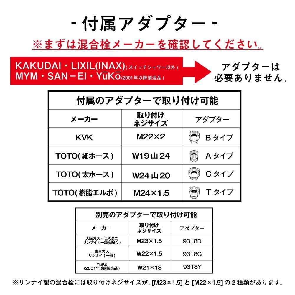 [適用混合栓メーカー]混合栓を接続する側のホースのBL金具の取付けネジサイズはG1/2です。本品はKAKUDAI、MYM、SAN-EI、YuKo(2001年製以降)、LIXIL(INAX)スイッチシャワー以外はそのまま取付けができます。付属のアダプターを使うことでKVK、TOTO(細ホース、太ホース、樹脂エルボ)が使用可能です。別売のアダプターを使うことで大阪ガス、リンナイ、東京ガス、YuKo(2001年製以前)に対応することができます。