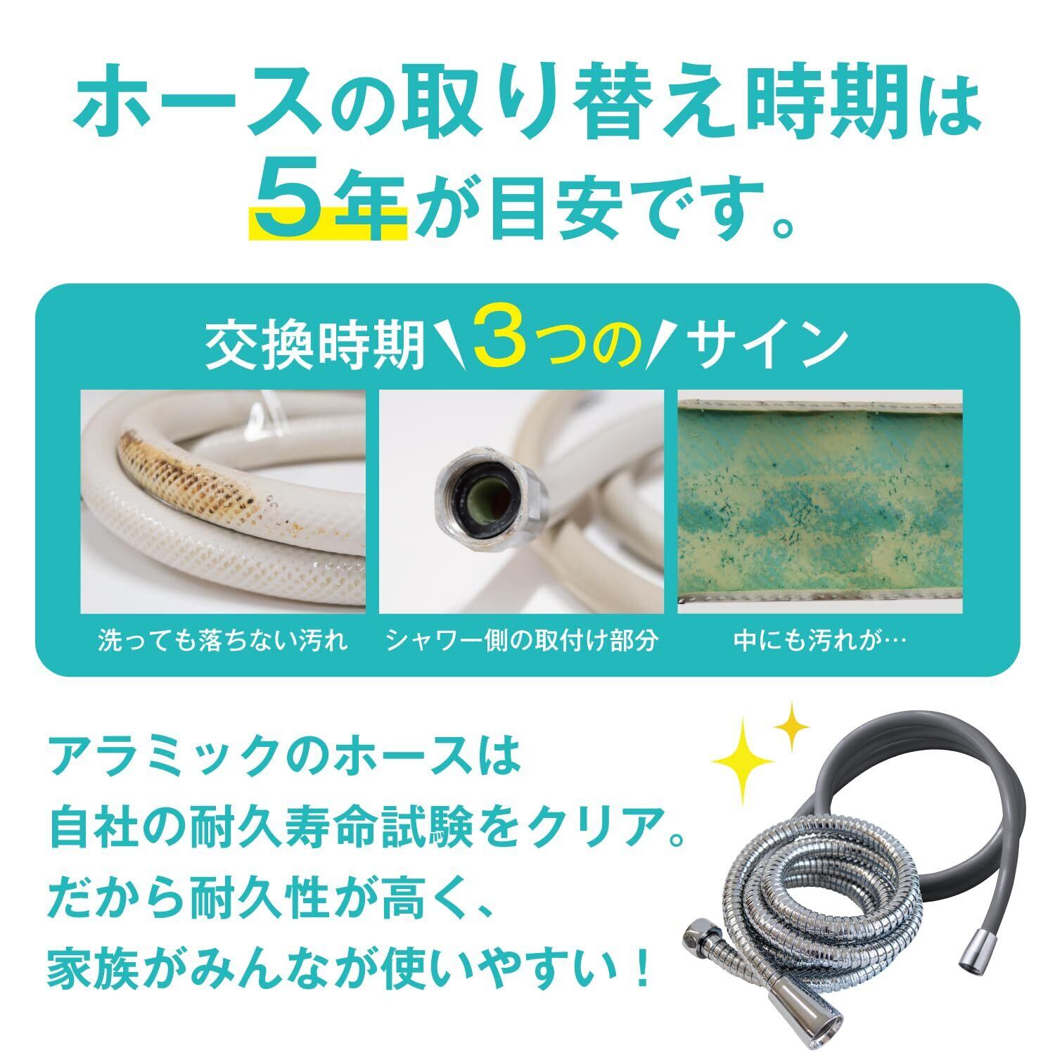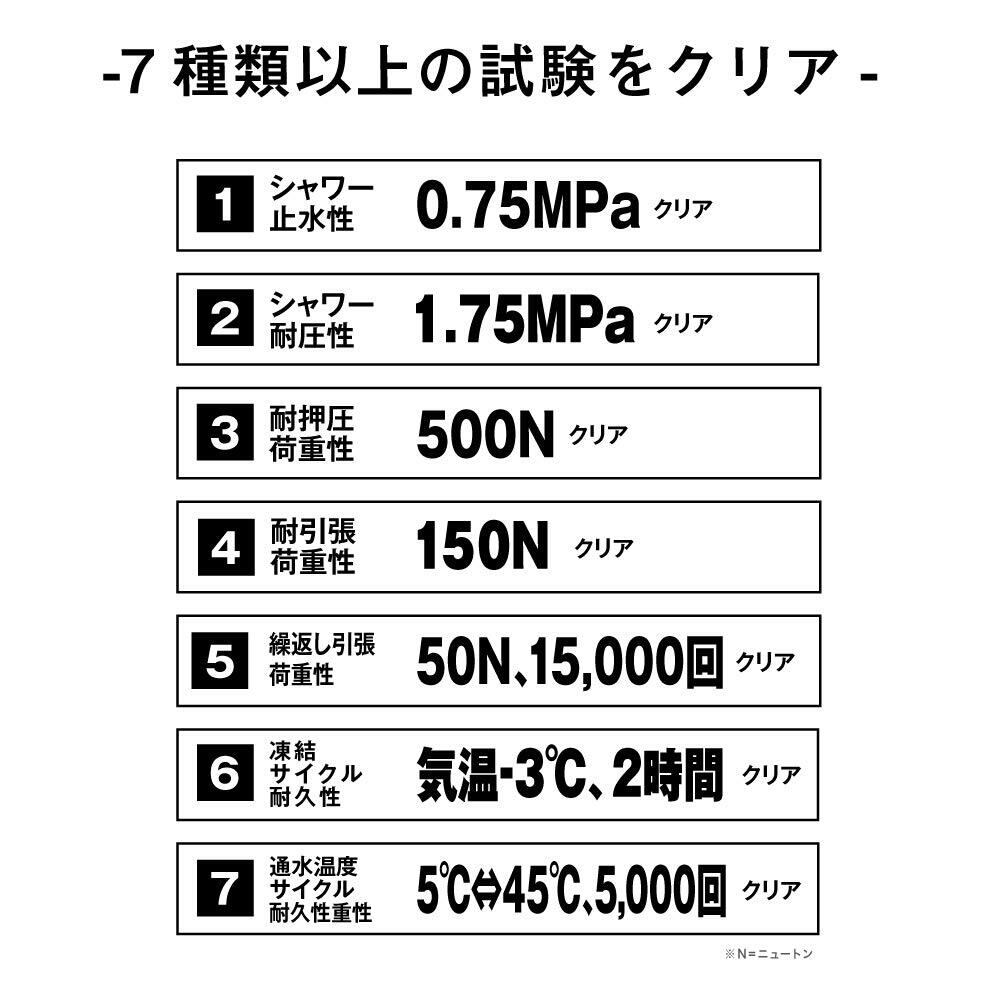 [抜群の耐久性] シャワー止水性、シャワー耐圧性、耐押圧荷重性、耐引張荷重性、繰返し引張荷重性、凍結 サイクル耐久性、通水温度 サイクル耐久性等、計7種類もの「耐久・寿命試験」を実施し、高い耐久性と強度を証明したシャワーホース。丈夫なだけでなく、清潔な状態をキープして衛生的にお使いいただけます。