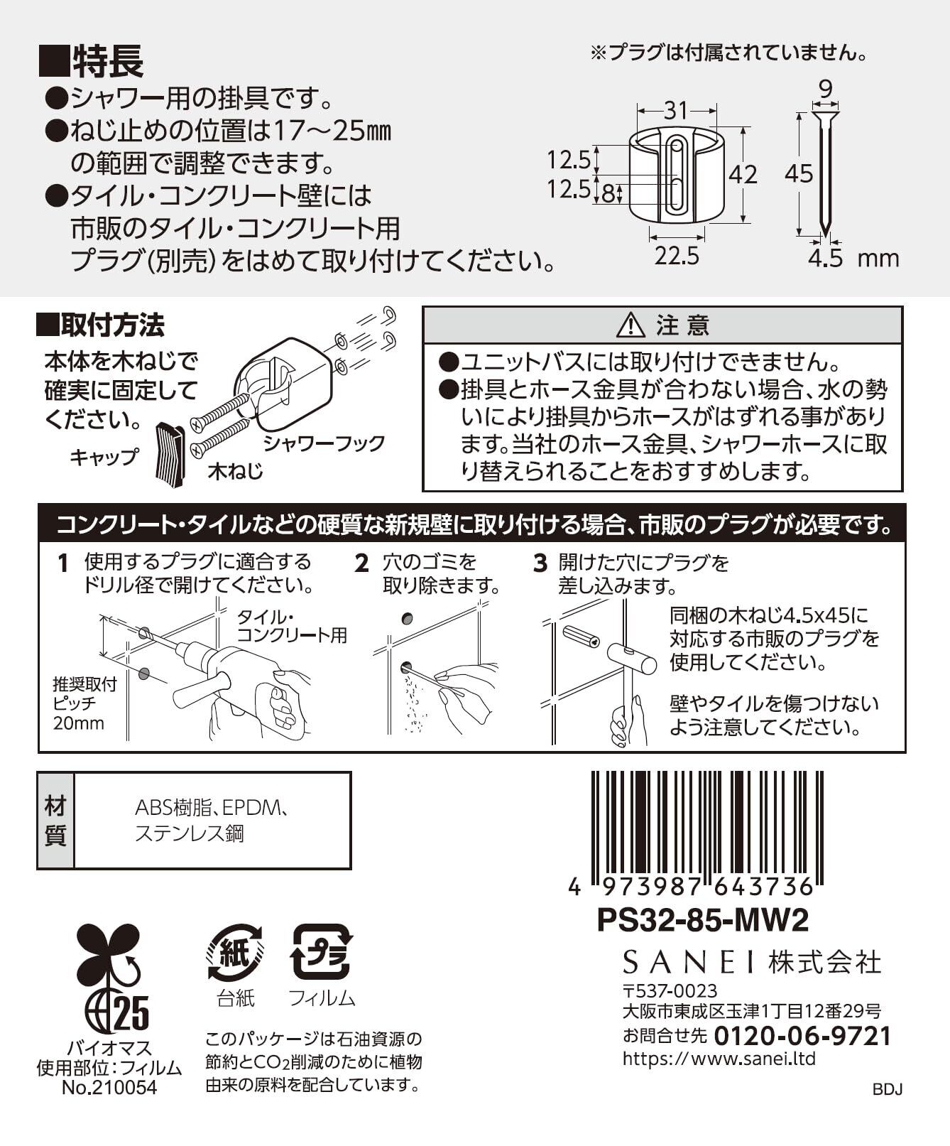 SANEI(サンエイ) PCシャワー掛具 17~25mmでビス位置調整可能 ビス付き PS32-85-MW2 マットホワイト