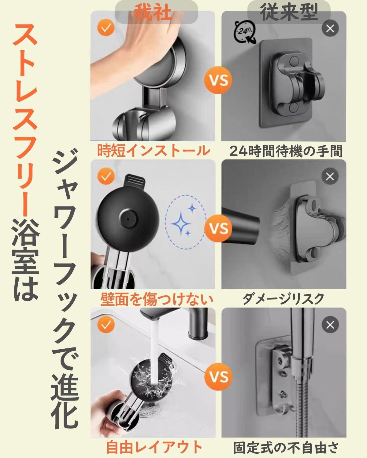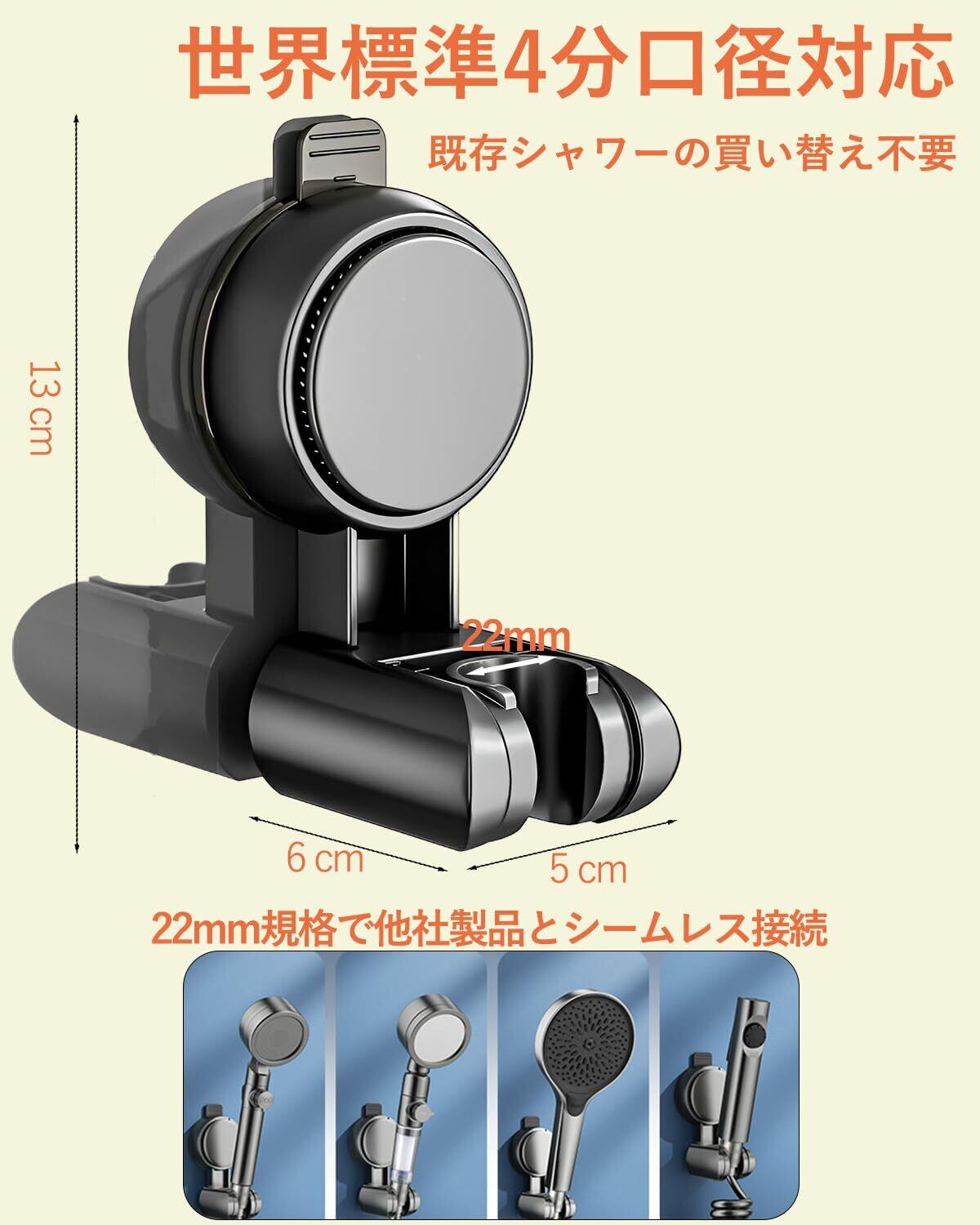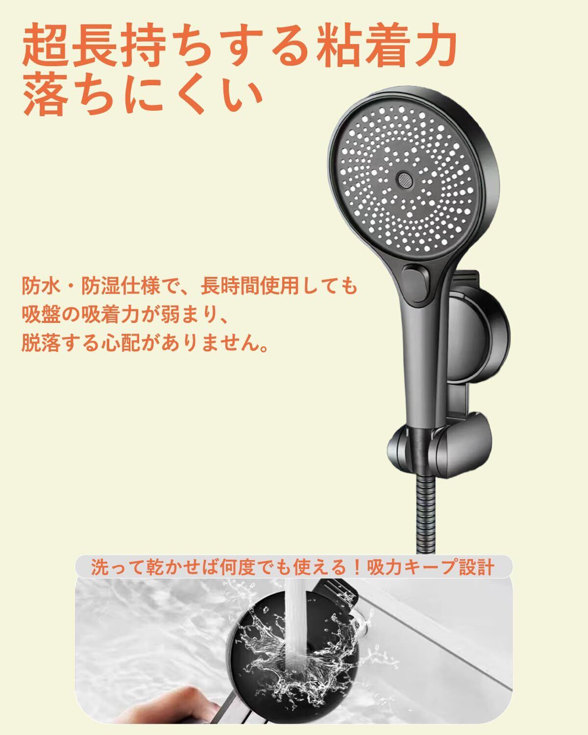 【強力固定&落下防止設計】耐荷重設計と強力吸盤の組み合わせで、シャワーヘッドをしっかりホールド。水圧や振動があってもズレにくく、大きめの吸盤で重めのシャワーヘッドにも対応。安定感抜群で、安心して使用できます。