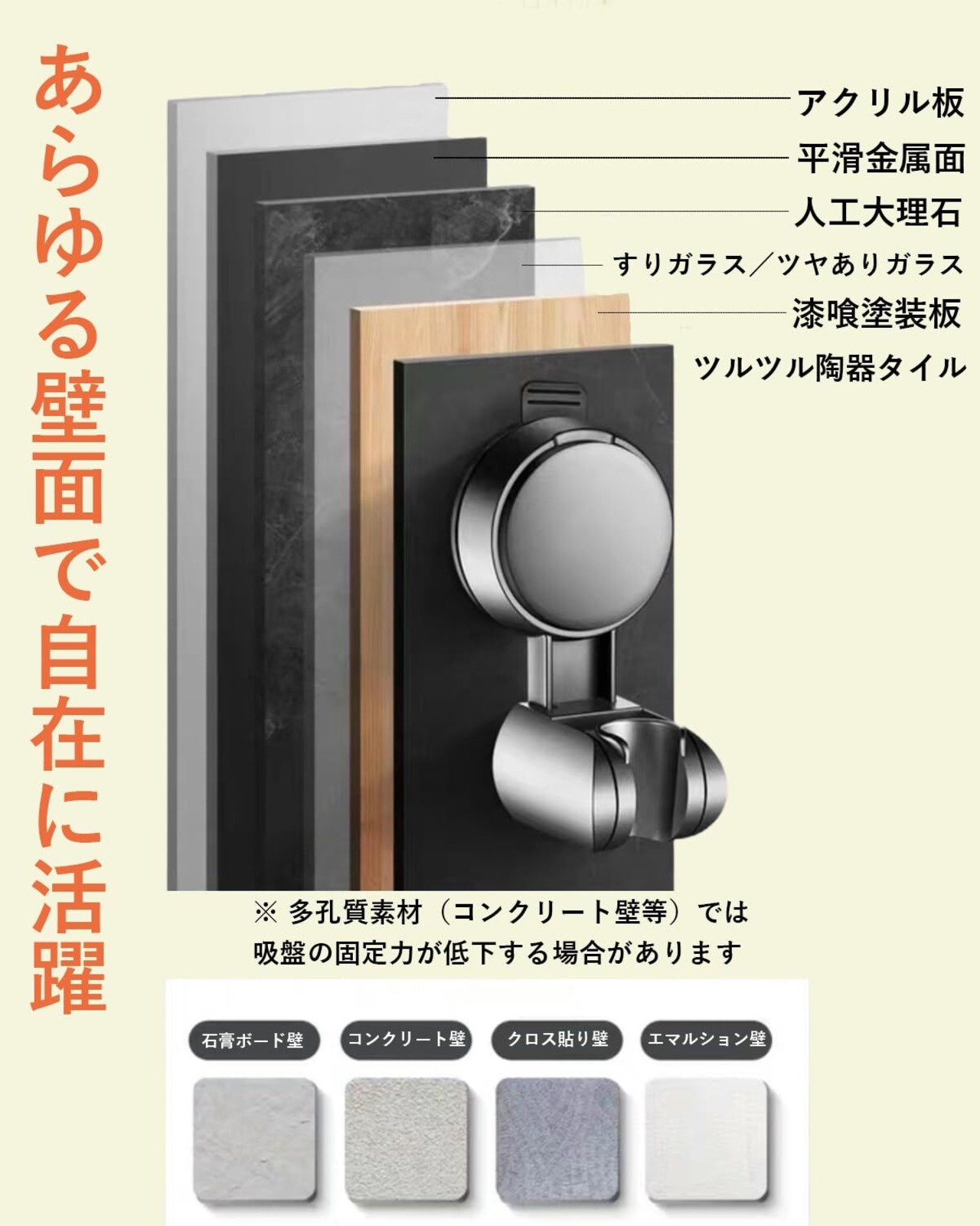 【幅広い互換性&粘着ディスク付き】タイル、ガラス、磨かれた金属などの滑らかな壁面に設置可能。さまざまなバスルーム環境にフィットし、取り付けの自由度が広がります。※※※この吸盤式シャワーホルダーはガラス、タイル、アクリル板、大理石などの滑らかな壁面に適しています。石膏ボードや塗装された壁面には使用できませんので、壁面の種類をご確認の上、ご使用いただけますようお願いいたします。