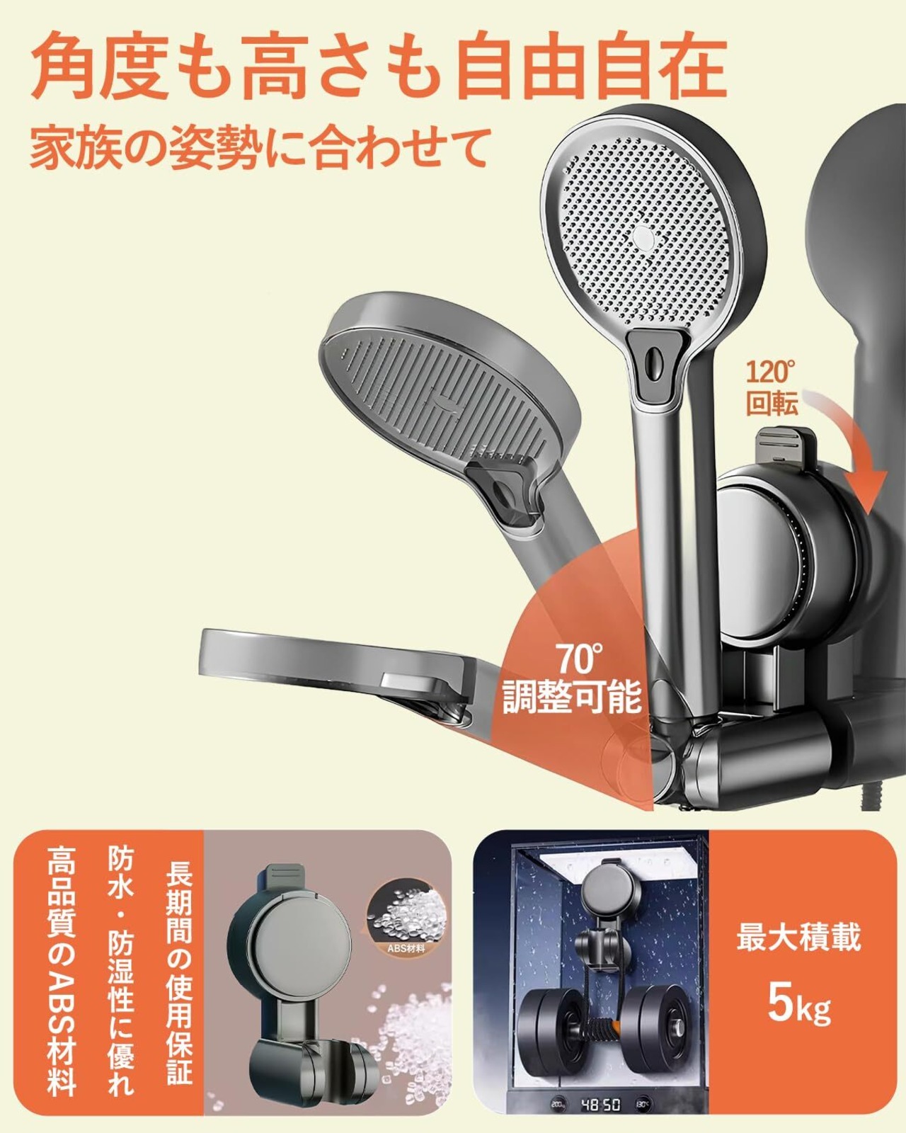 【角度&高さ自由調整】上下70°の角度調整と120°回転機能を搭載し、家族の身長や使用スタイルに合わせてシャワーヘッドの位置を自由にカスタマイズ可能。最適な位置にセットすることで、より快適でリラックスしたシャワータイムを実現します。(花洒がしっかりとシャワーホルダーに固定されるように、接続部の安定性を強化しました。角度調整時には少し力を加えるだけで調整できます。)