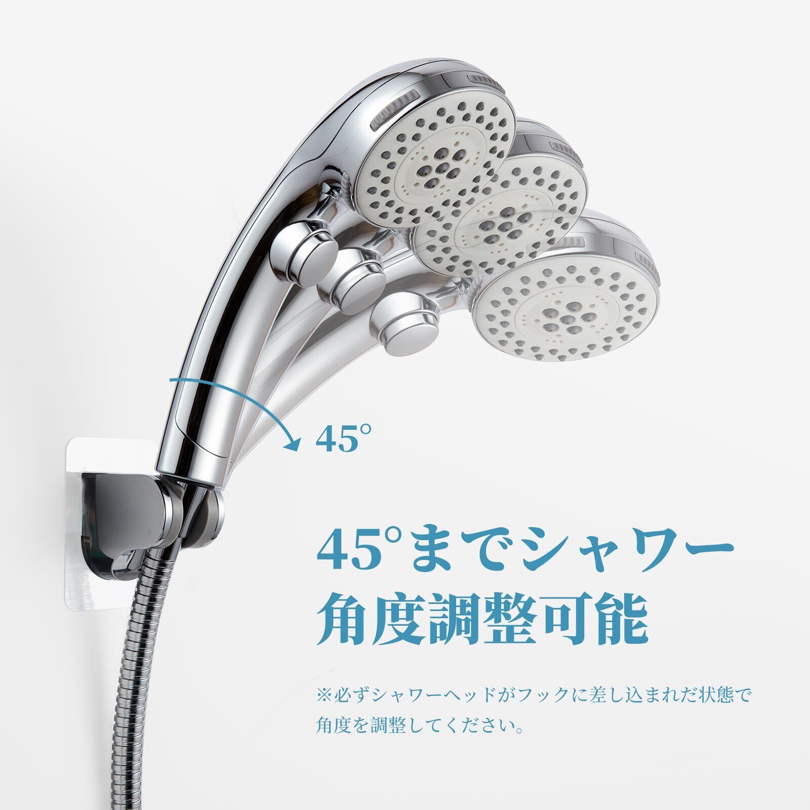 [角度調節可能]フックにシャワーヘッドを差し込んだ状態で、シャワー角度が120°調整可能です。お浴びたい角度に調整できます。