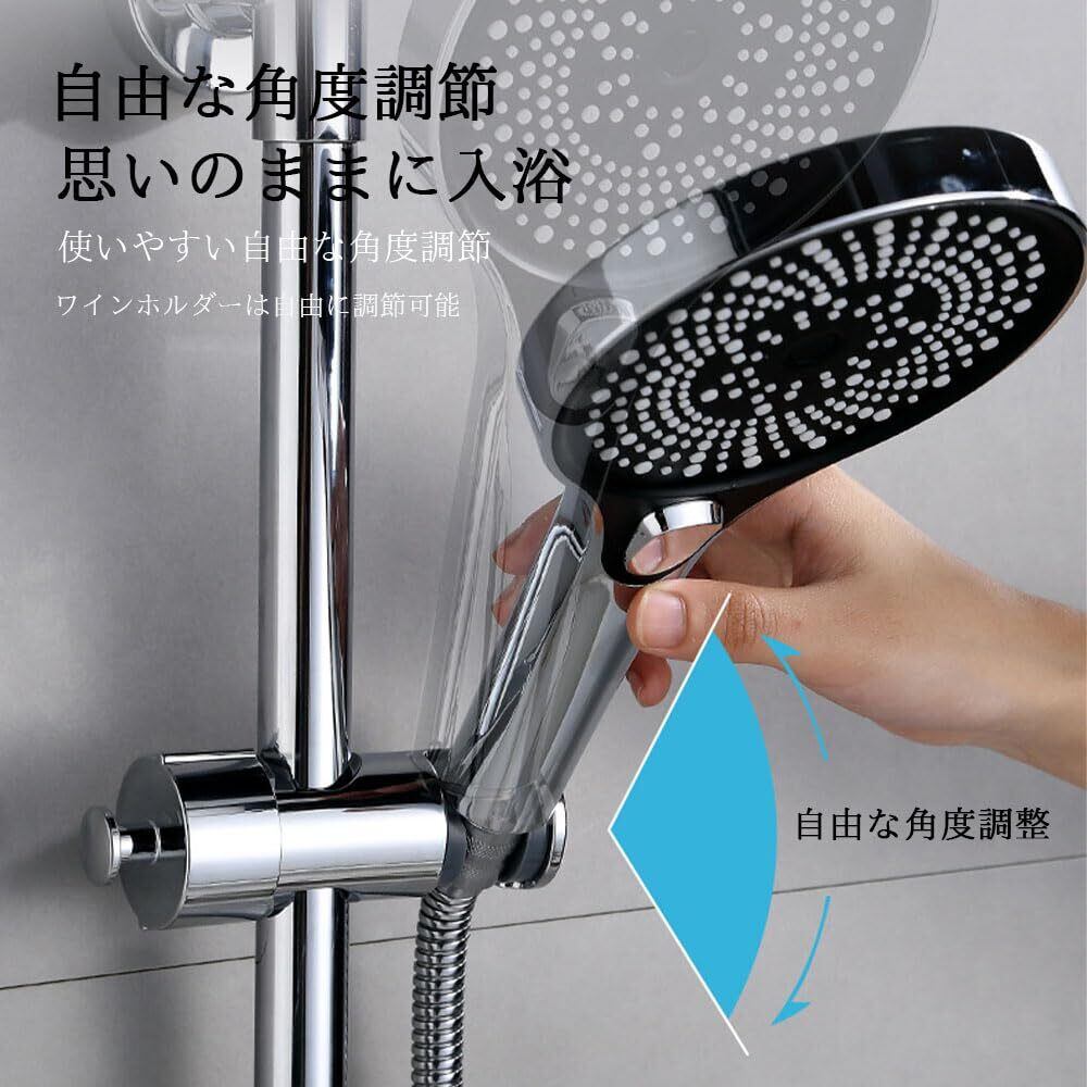 【自由自在な角度調整】シャワーヘッドの角度をユーザーの好みに合わせて自由に調整でき、シャワーを十分に浴びることができます。 体の特定の部分を洗い流したいときでも、シャワーの水流を大きく楽しみたいときでも、シャワーヘッドを回転させるだけで簡単に行えます。 この機能は、青い矢印と というテキスト、そしてシャワーヘッドの角度を調整する方法を示す手によって、写真にはっきりと示されています。