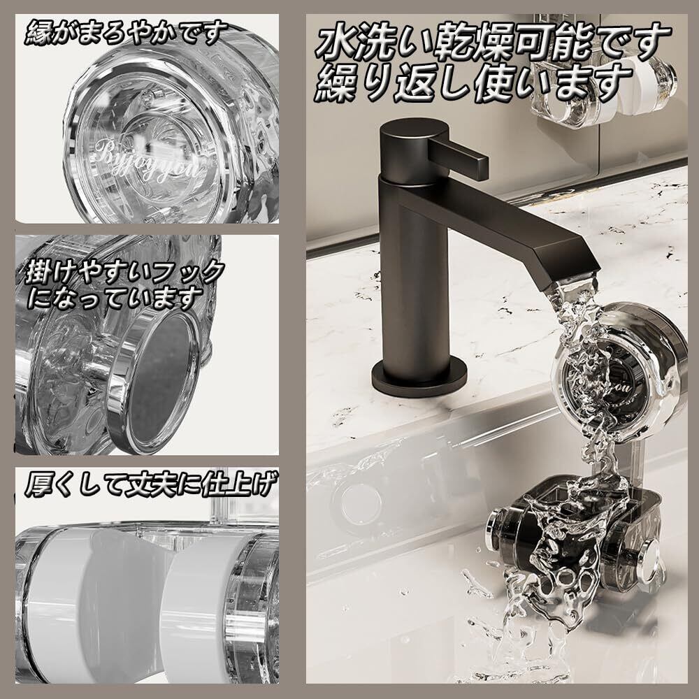 【繰り返し可能な取り付け】 吸盤フックは高さで自由に繰り返し取り付けることができ、吸盤式の設計は固定効果に影響を与えず、壁面を傷つけることはなく、位置を交換しても、清潔にしても、引っ越しても、いつでも取り外して取り付け直すことができます