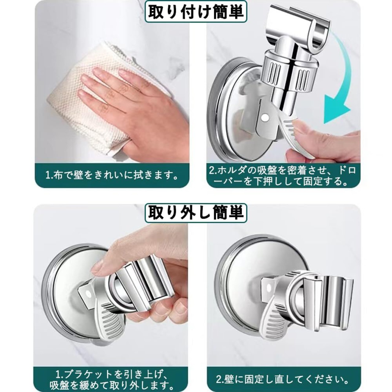 【取り付け簡単】穴を開ける必要がなく、壁を傷つけることもない。シャワーヘッドの吸盤を取付面にしっかりと押し付けると、レバーを引っ張ると真空吸着固定になります。