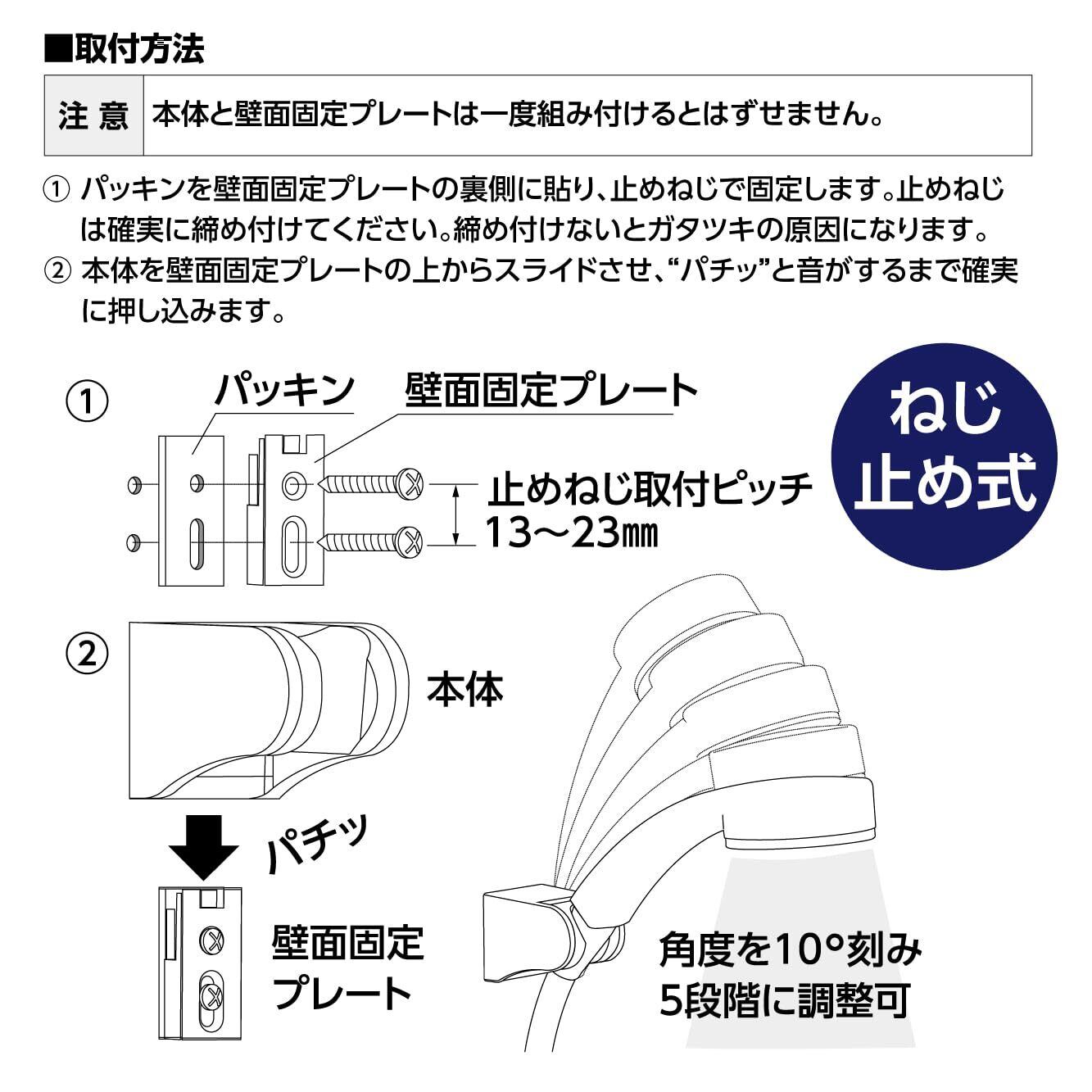 【取付方法】①パッキンを壁面固定プレートの裏側に貼り、止めねじで固定します。止めねじは確実に締め付けてください。締め付けないとガタツキの原因になります。②本体を壁面固定プレートの上からスライドさせ、パチッと音がするまで確実に押し込みます。