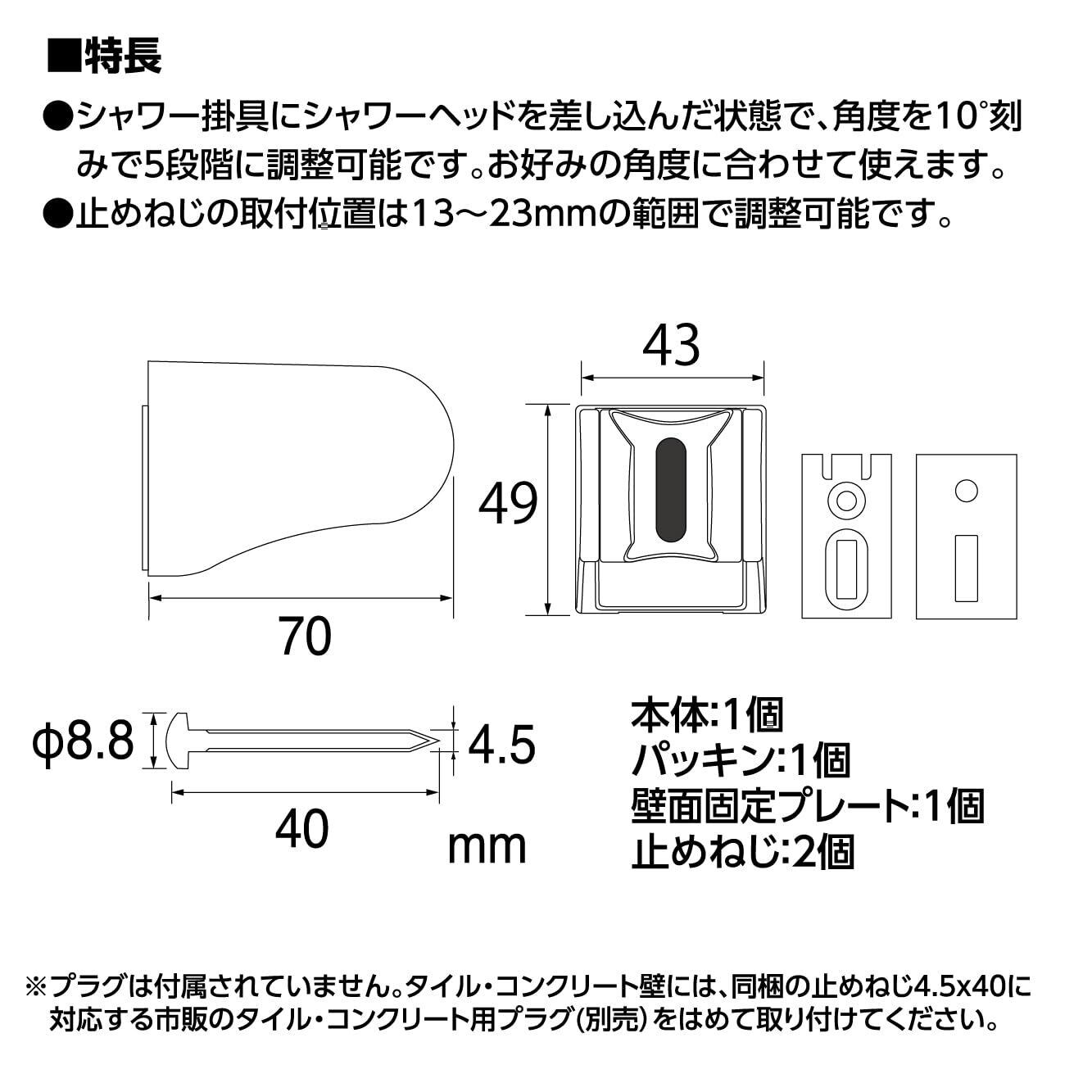 止めねじの取付位置は13~23mmの範囲で調整できます。※プラグは付属されていません。タイル・コンクリート壁には、同梱の止めねじ4.5X40に対応する市販のタイル・コンクリート用プラグ(別売)をはめて取付けてください。