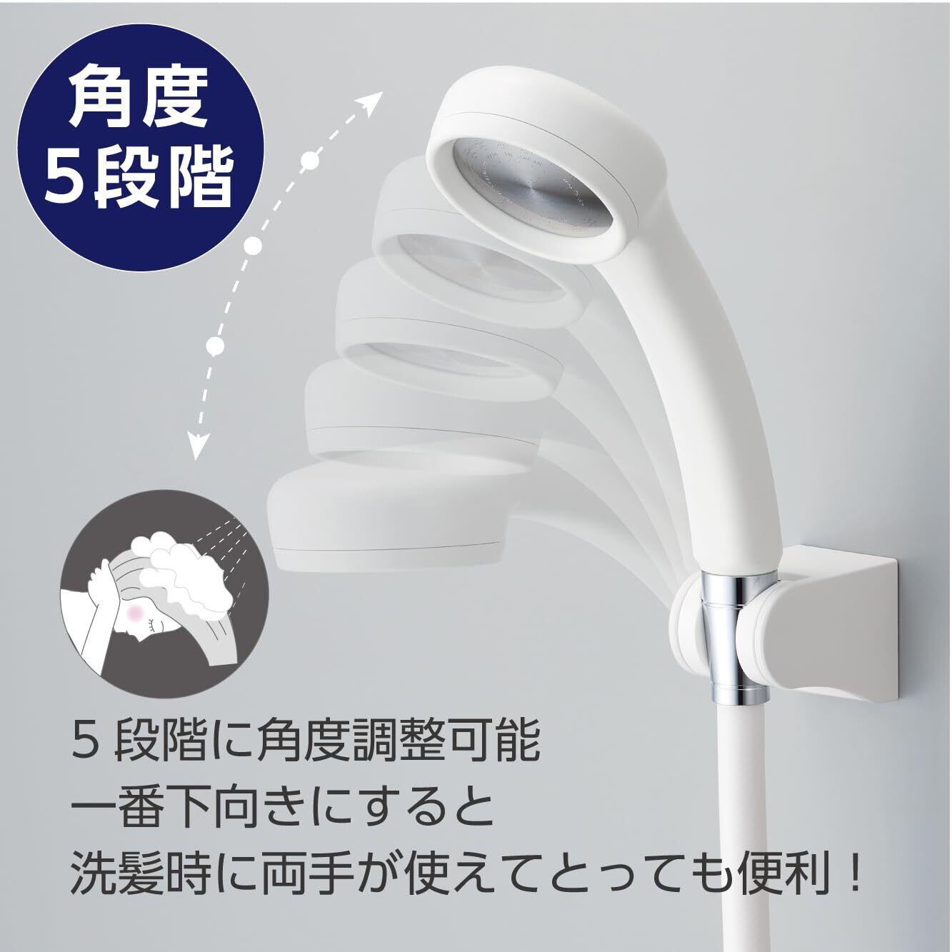 シャワー掛具にシャワーヘッドを差し込んだ状態で、角度を10°刻みで5段階に調整可能です。お好みの角度に合わせて使えます。