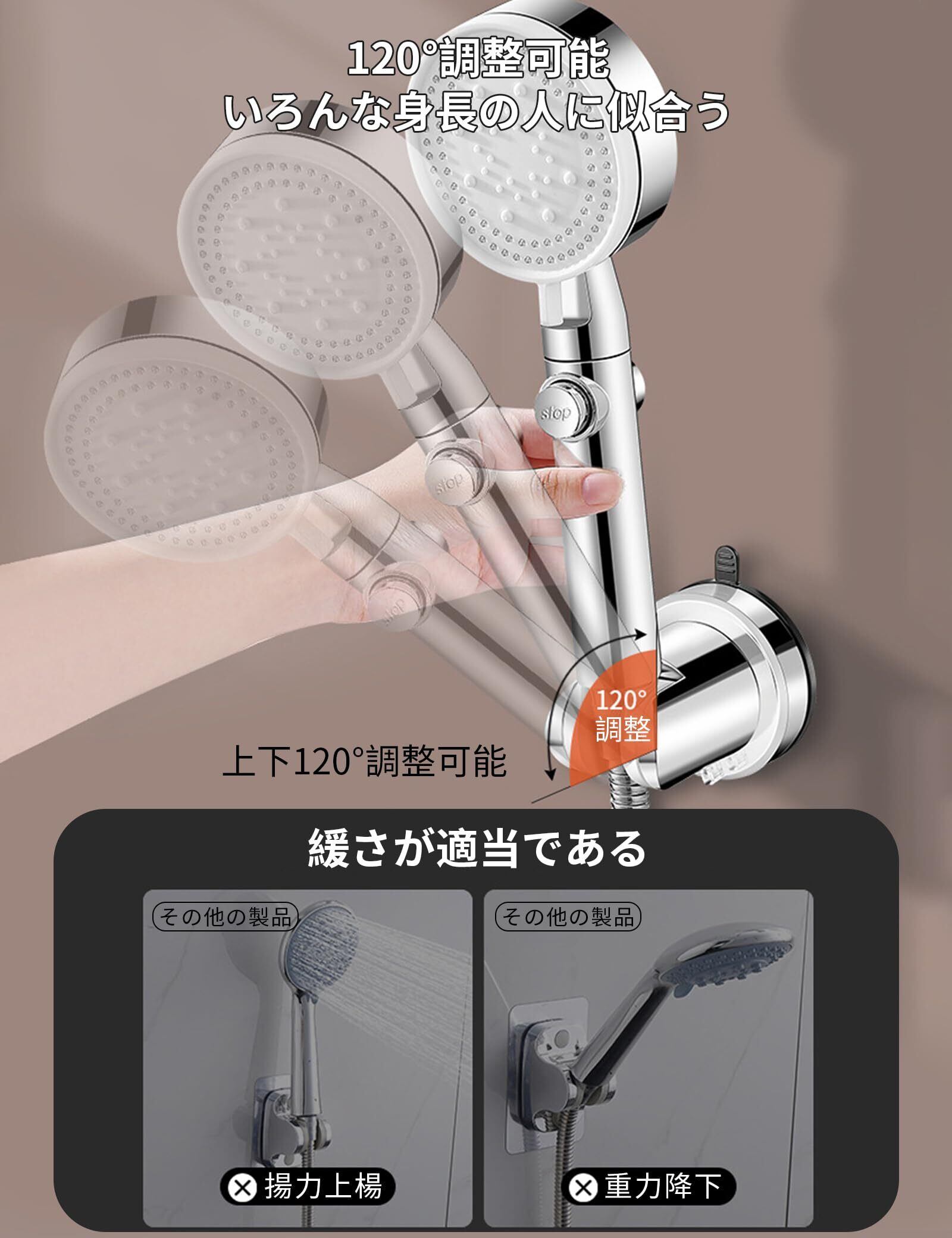 【120°調整可能なシャワーフック】強力吸盤型シャワーヘッドホルダーはほとんどの既存のシャワーヘッドを固定するための調整可能なスロットがあります、お好みの角度でシャワーを浴びることができます。