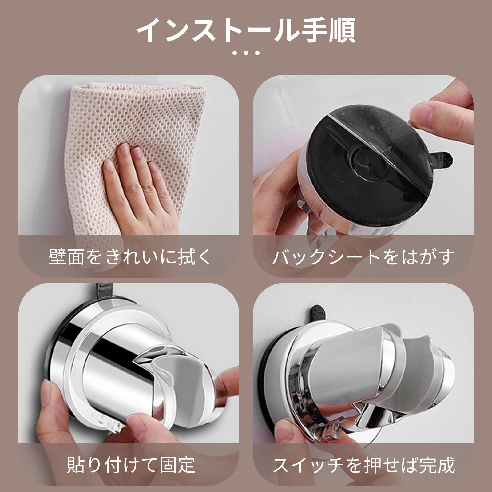 【取り付けが簡単】シャワーヘッドスタンドは真空吸盤取付方式。ネジ、釘、接着剤、工具は必要なく、壁を傷つけないです。 何度も再利用でき、跡も残さず簡単に剥がすことができます。