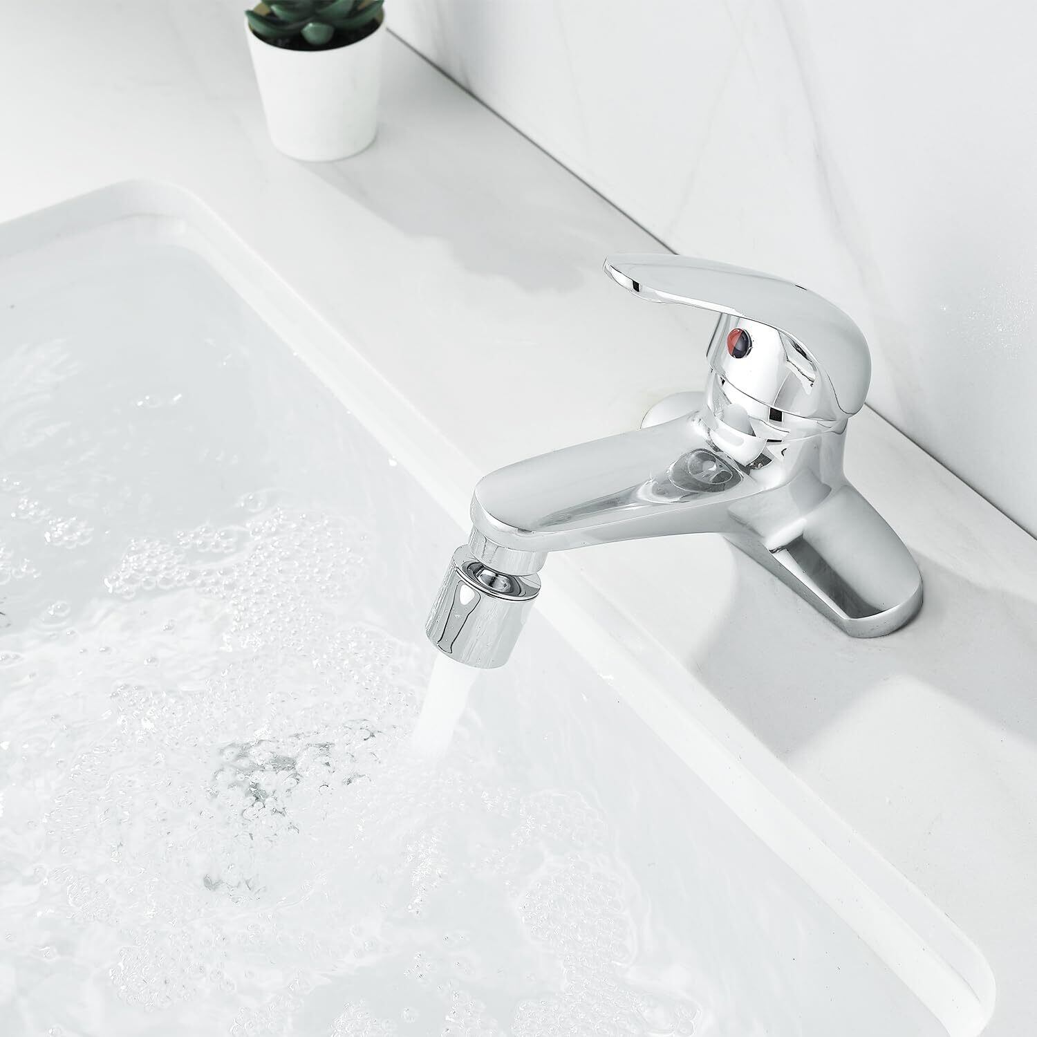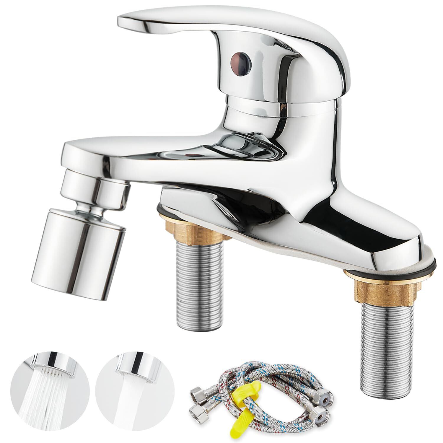 洗面水栓 洗面用混合栓 洗面台蛇口 2穴 ツーホール式 360°回転可能な注ぎ口 2つの吐水モード 冷 温 切り替え 水栓金具 取り付けホース付き 真鍮製 (クロム)