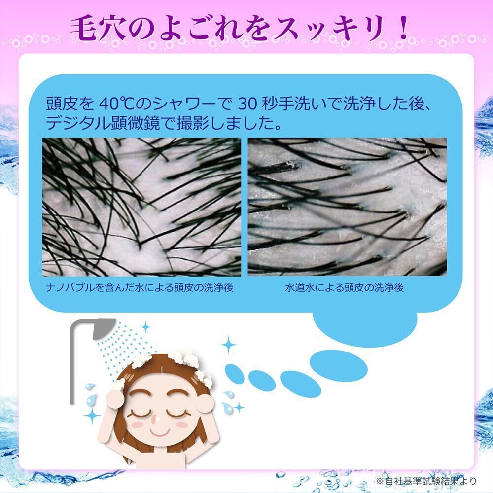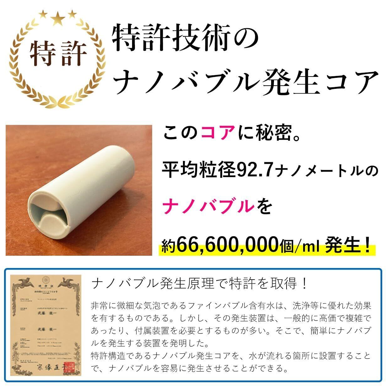 ●「ナノバブルとは」ナノバブルは、通常の気泡やマイクロバブルの直径などよりも小さい微細な気泡です。本体に内蔵されているコアの構造により、水流を旋回させ水に含まれる気泡からナノサイズの気泡「ナノバブル」を発生させます。「ナノバブル」は目に見える気泡のようには浮き上がらず、ブラウン運動をしながらその場に停滞します。水中で気泡表面がマイナスに帯電するため、気泡は互いに反発しあい、プラスに帯電したよごれを引き付けるため、洗浄効果があると考えられています。