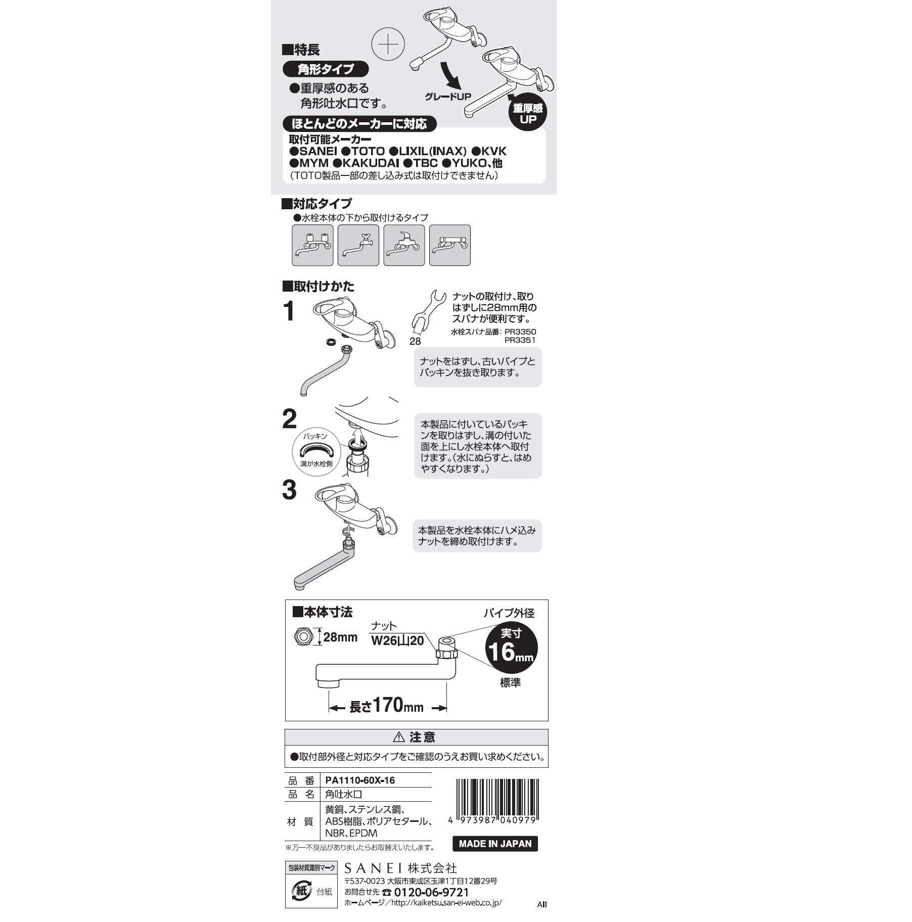 【人気商品】SANEI(サンエイ) 角吐水口 ソフト整流 直径16mm 長さ170mm W26山20 ほとんどのメーカー対応 PA1110-60X-16