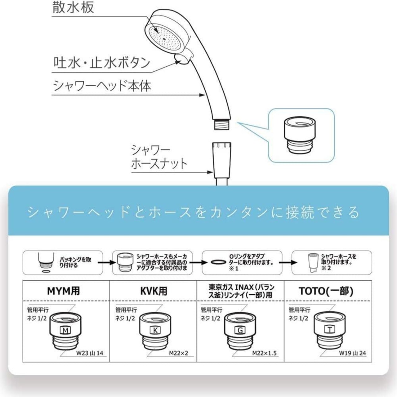 【使用】シャワーヘッドとシャワーホースが接続されているねじ寸法が合わない場合は、ブラックワッシャとOリングを使用して調整することができます。