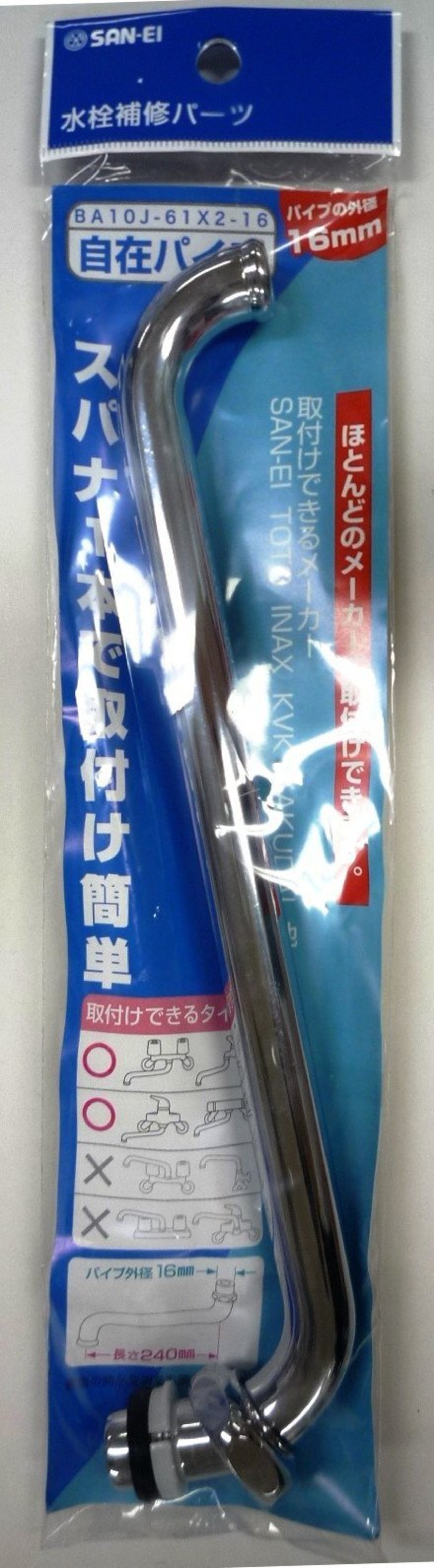 一般家庭にもっとも多く使用しているのが外径16mmパイプで、三栄、TOTO、INAX、KVK、MYM、KAKUDAI、TBC、YUKO、他、ほとんどの混合栓・単水栓に取付けができる。 ※ただしTOTO製品一部の差込式には未対応。