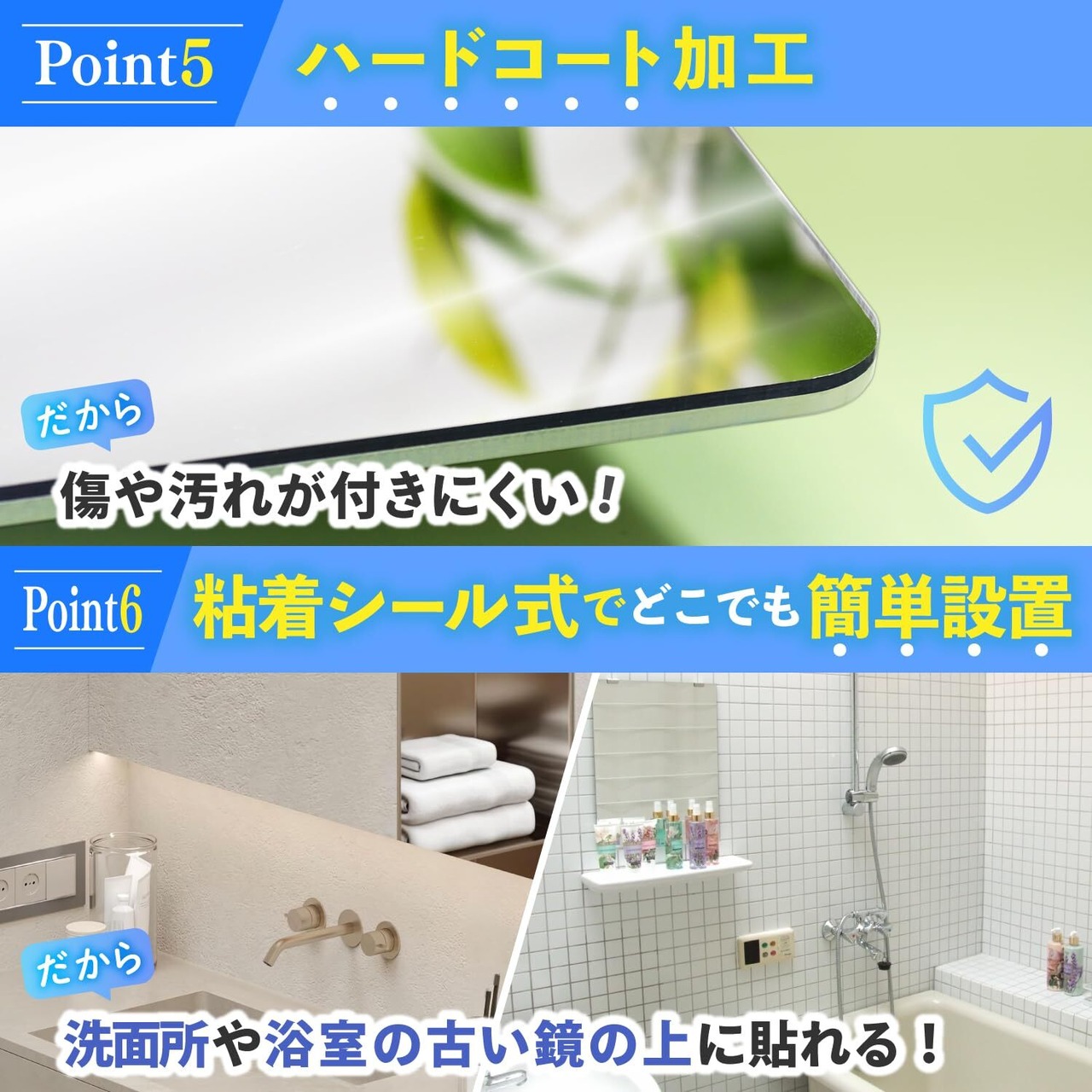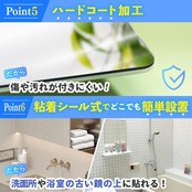 【商品基本仕様】ココミラーCocoMirror購入のお客様の要望におこたえして、浴室専用の割れない鏡、CocoMirror Bath を開発いたしました。1.曇り止め加工、 2.粘着シール式、3.こだわりの映像、4.割れない、5.ハードコート加工(汚れ・傷防止)の特徴があります。※曇り止め加工をしていますが全くもらないわけではありません。曇った際は水をかけてください。