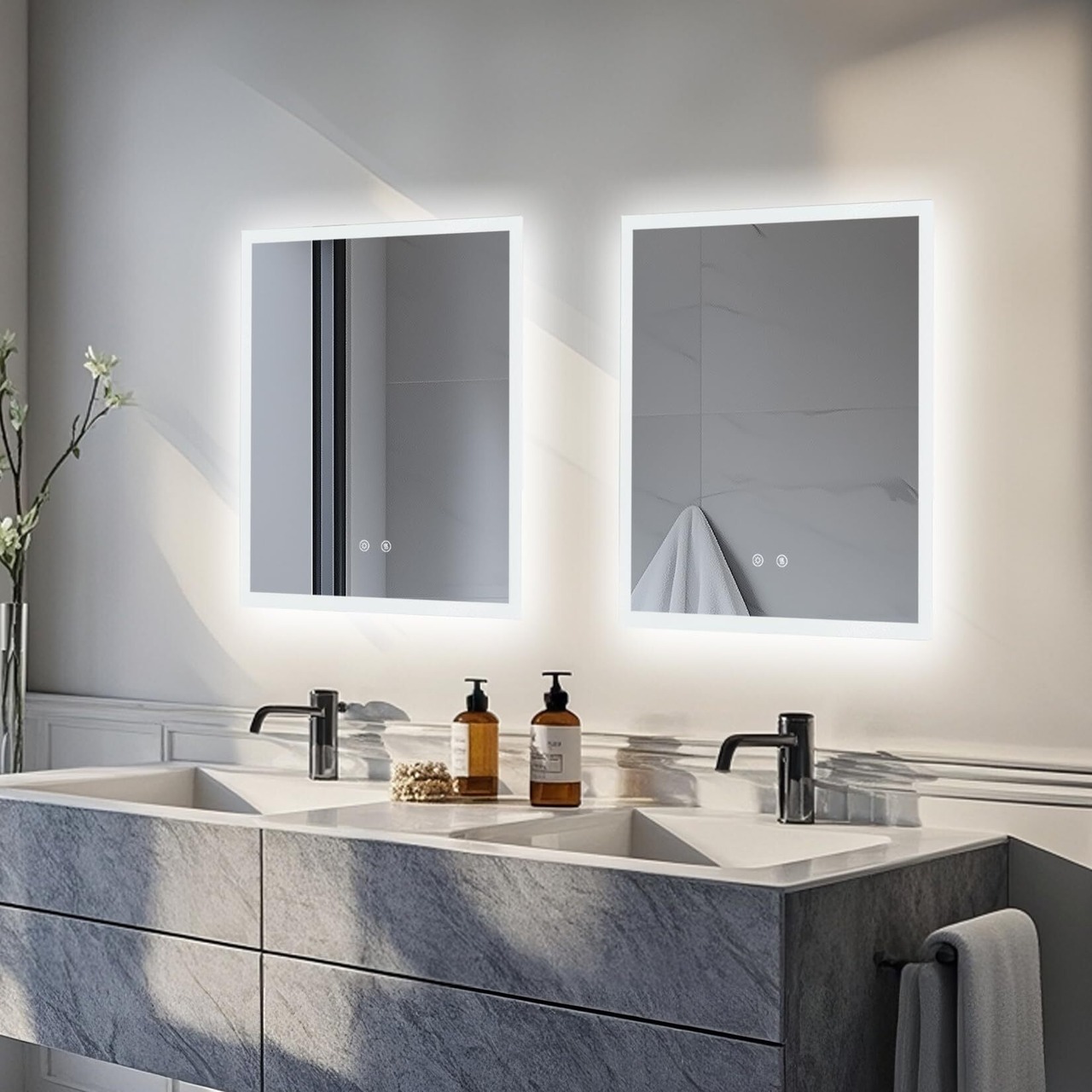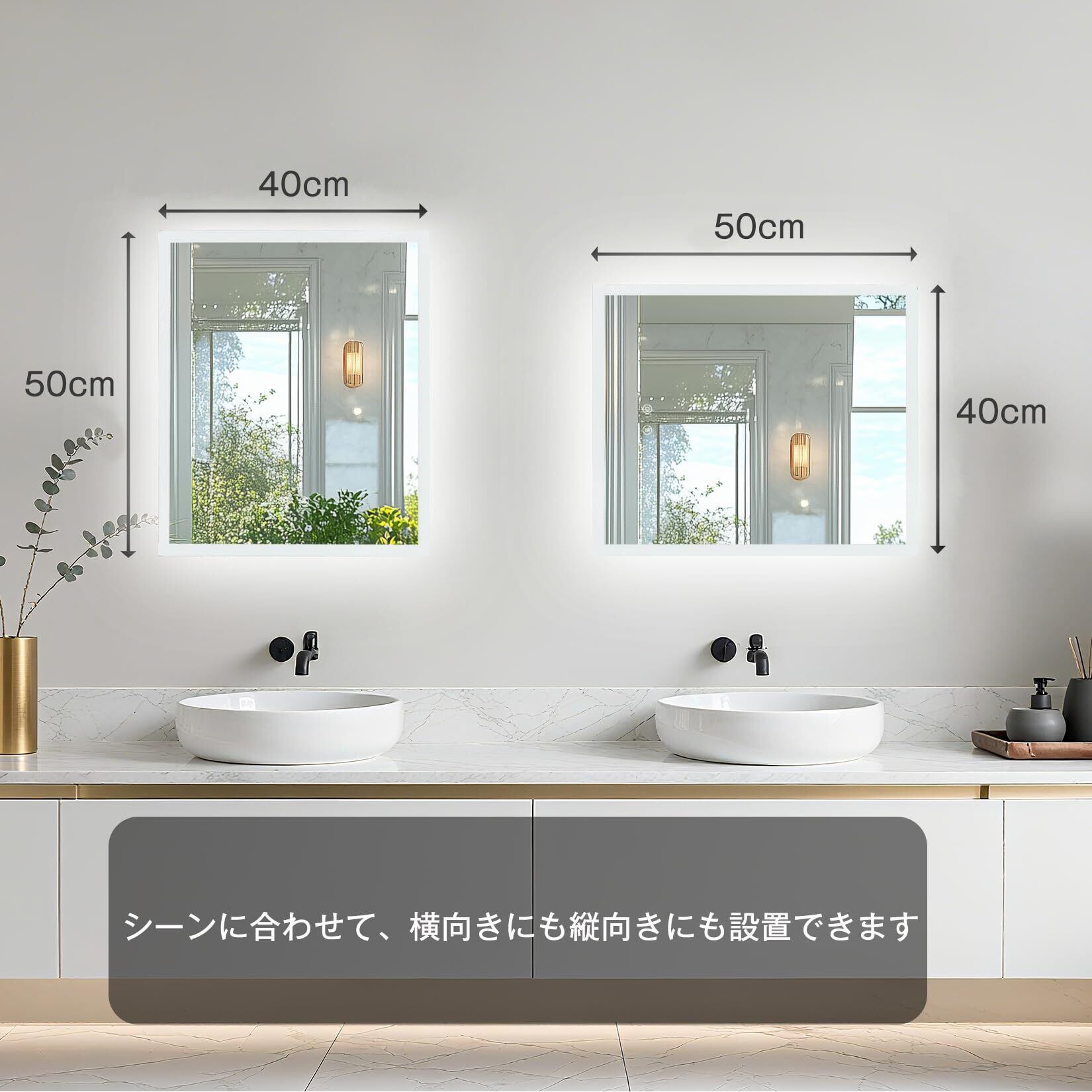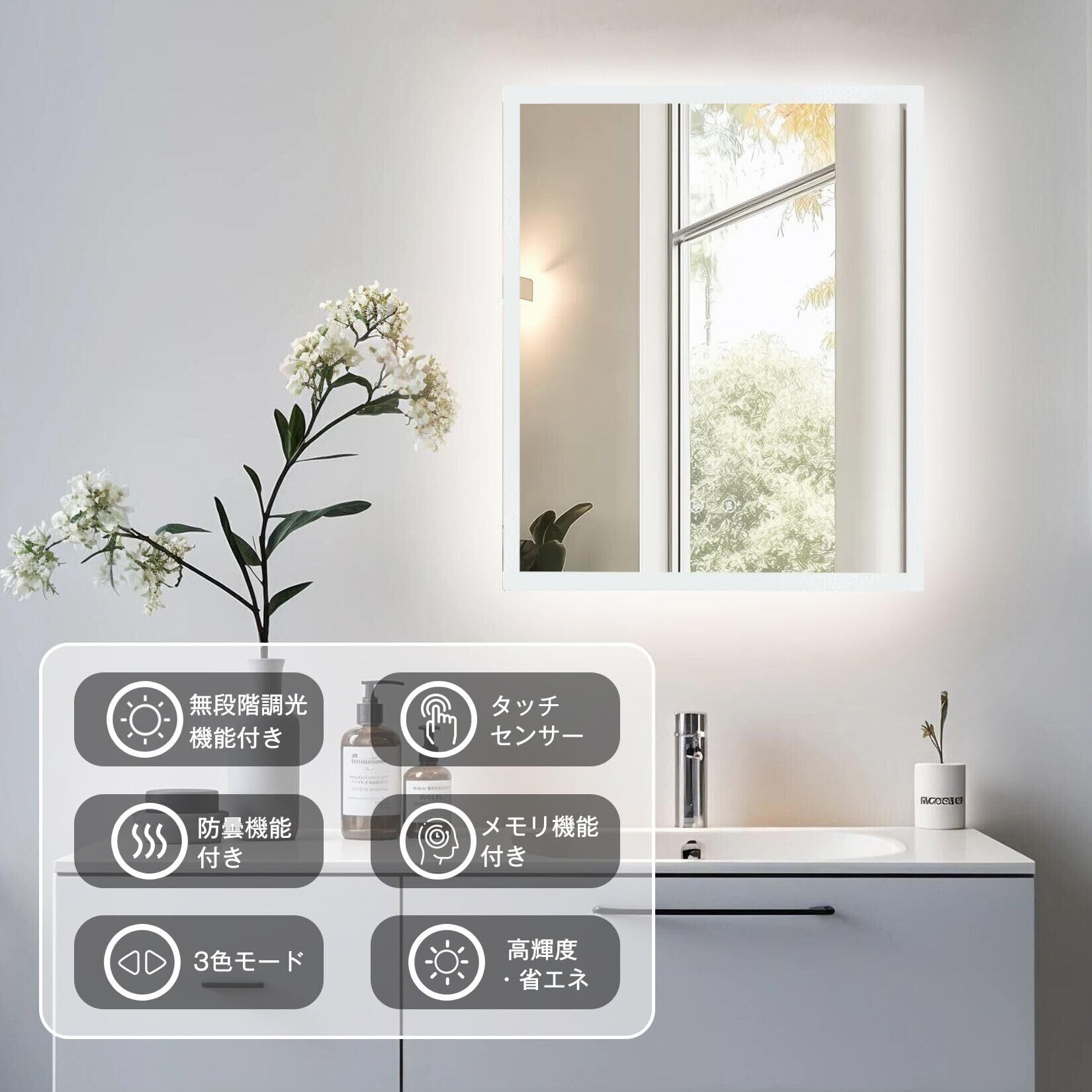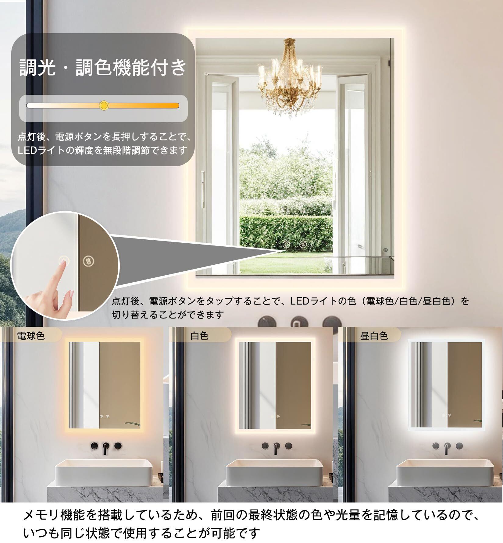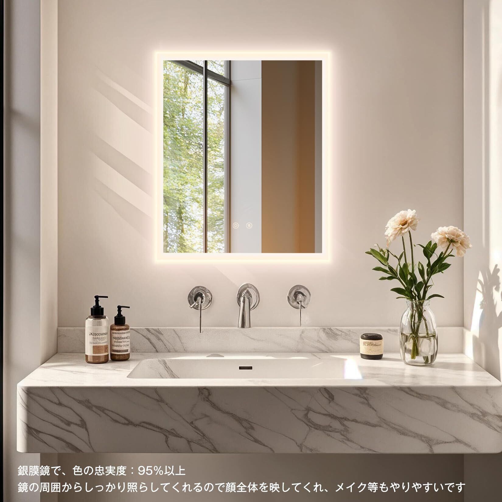 【冬場でも便利に使える曇らない鏡】広いヒーター付きの洗面鏡で、鏡面にある防曇ボタンをタップし、鏡を温めることで蒸気による鏡の曇りを防いだり解消したりできるため、冬に使用するのにとても便利です