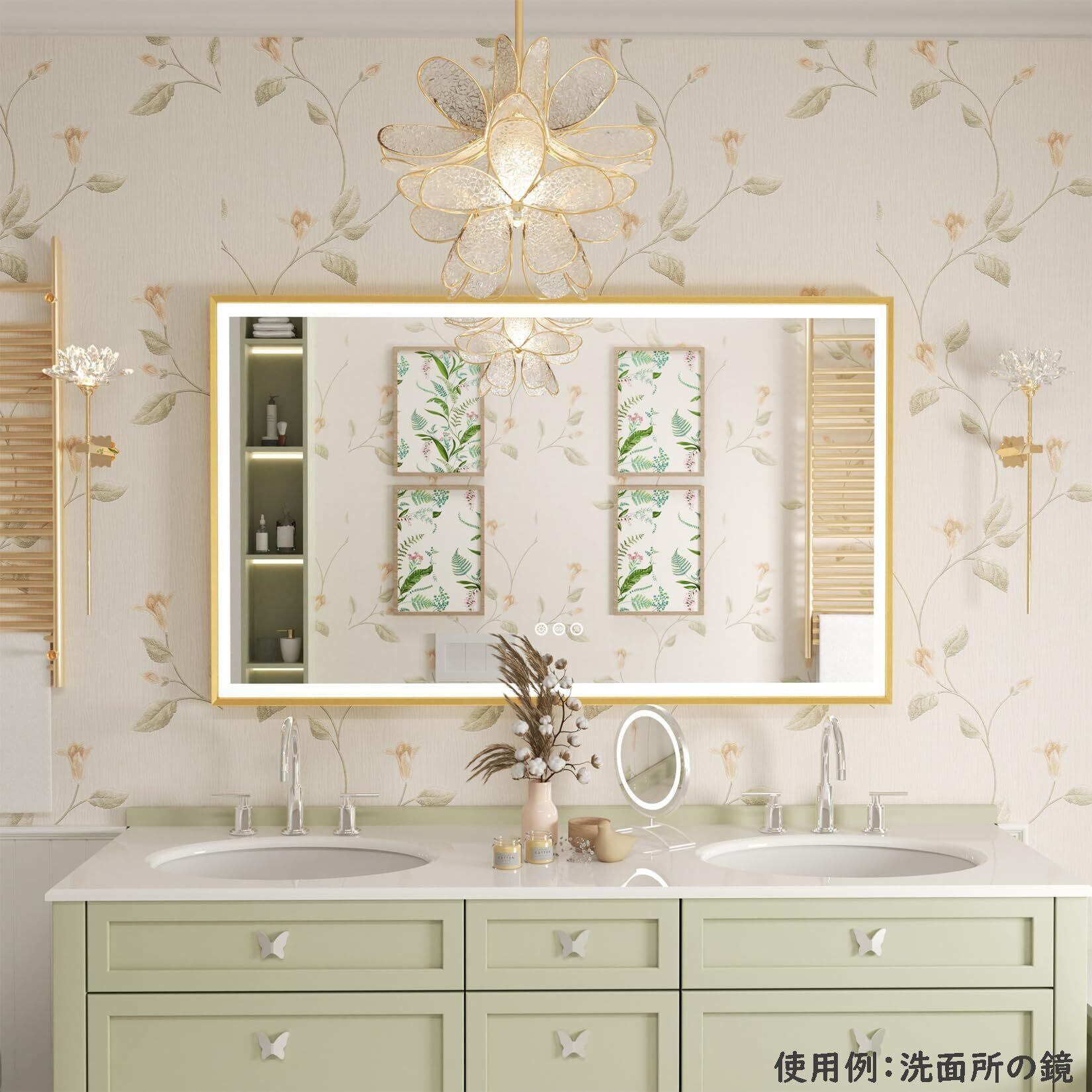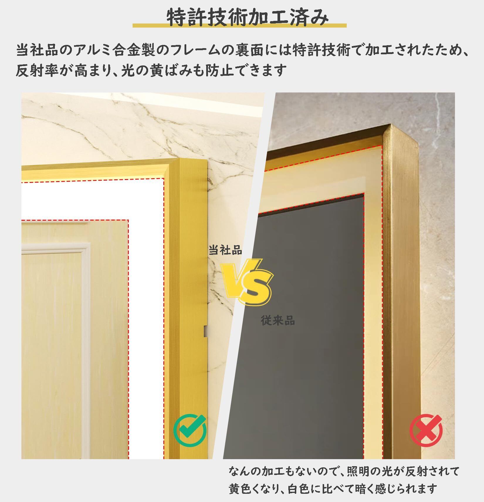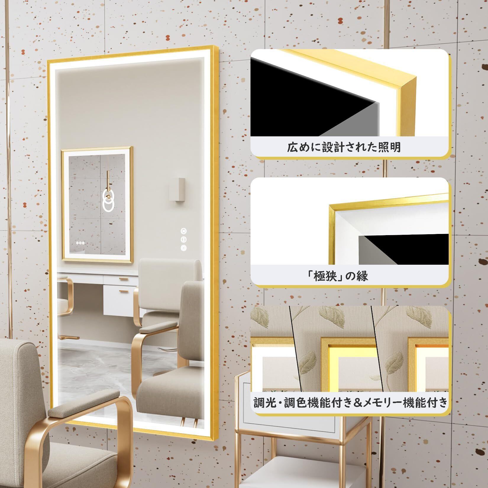 Susire 洗面鏡 壁掛け 全身鏡 100cm×60cm 大きい ledライト付き ゴールドフレーム 照明付き 姿見 玄関 洗面所の鏡 おしゃれ 長方形 横長 美容室 女優ミラー モダン 高級 飛散防止