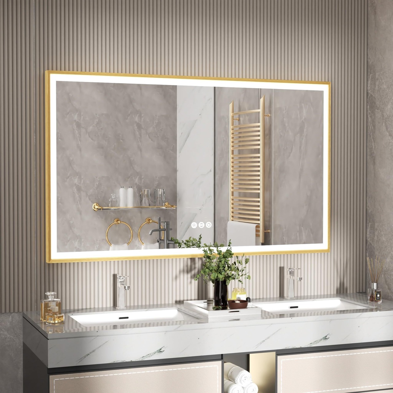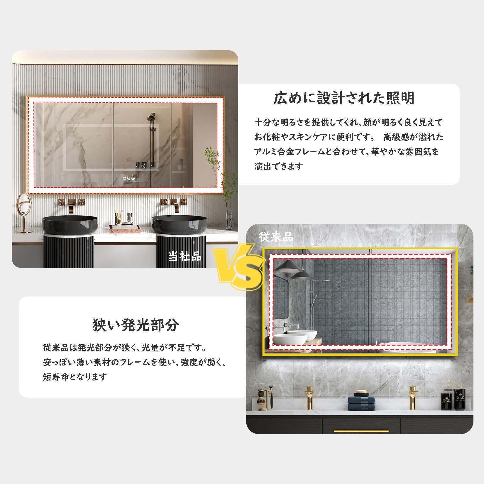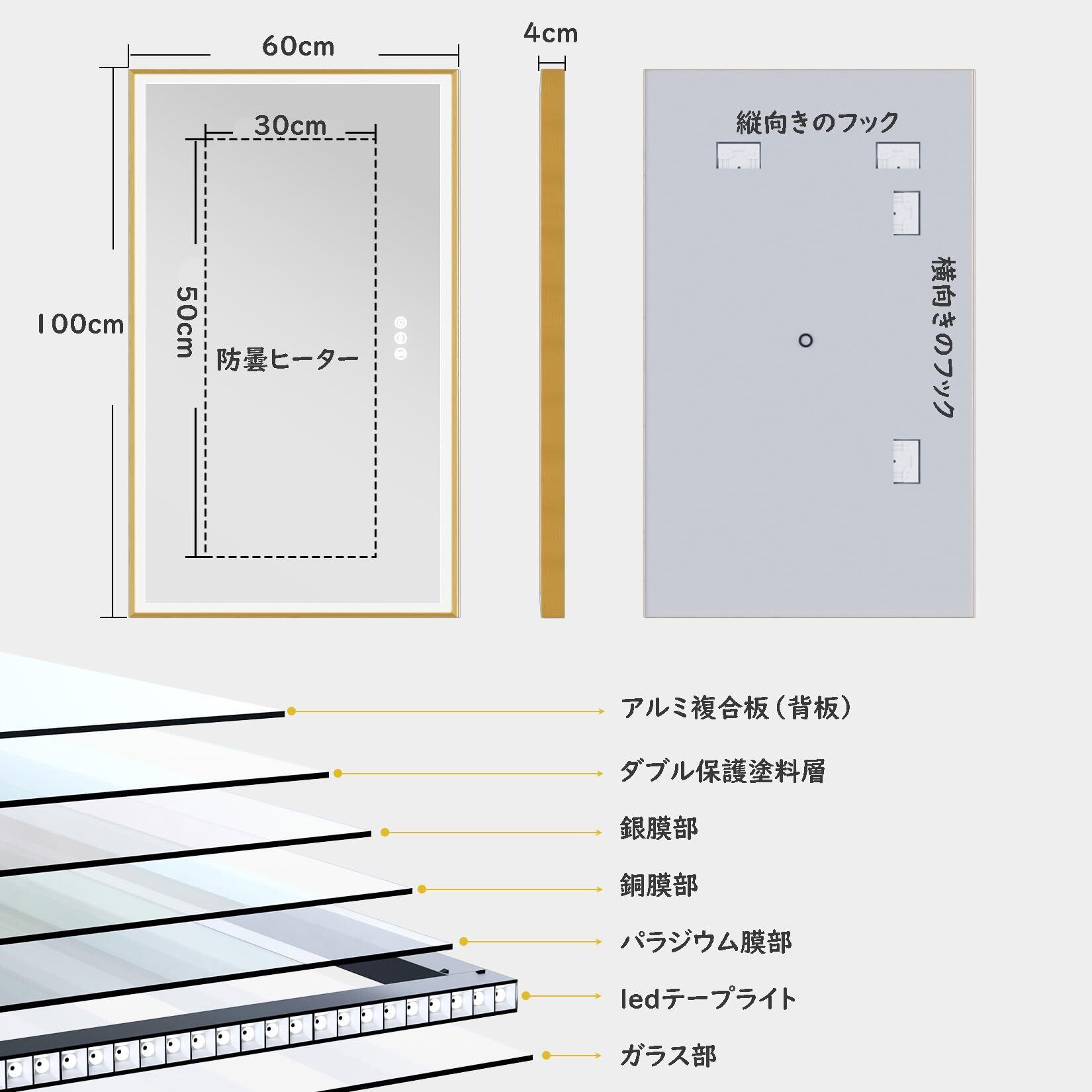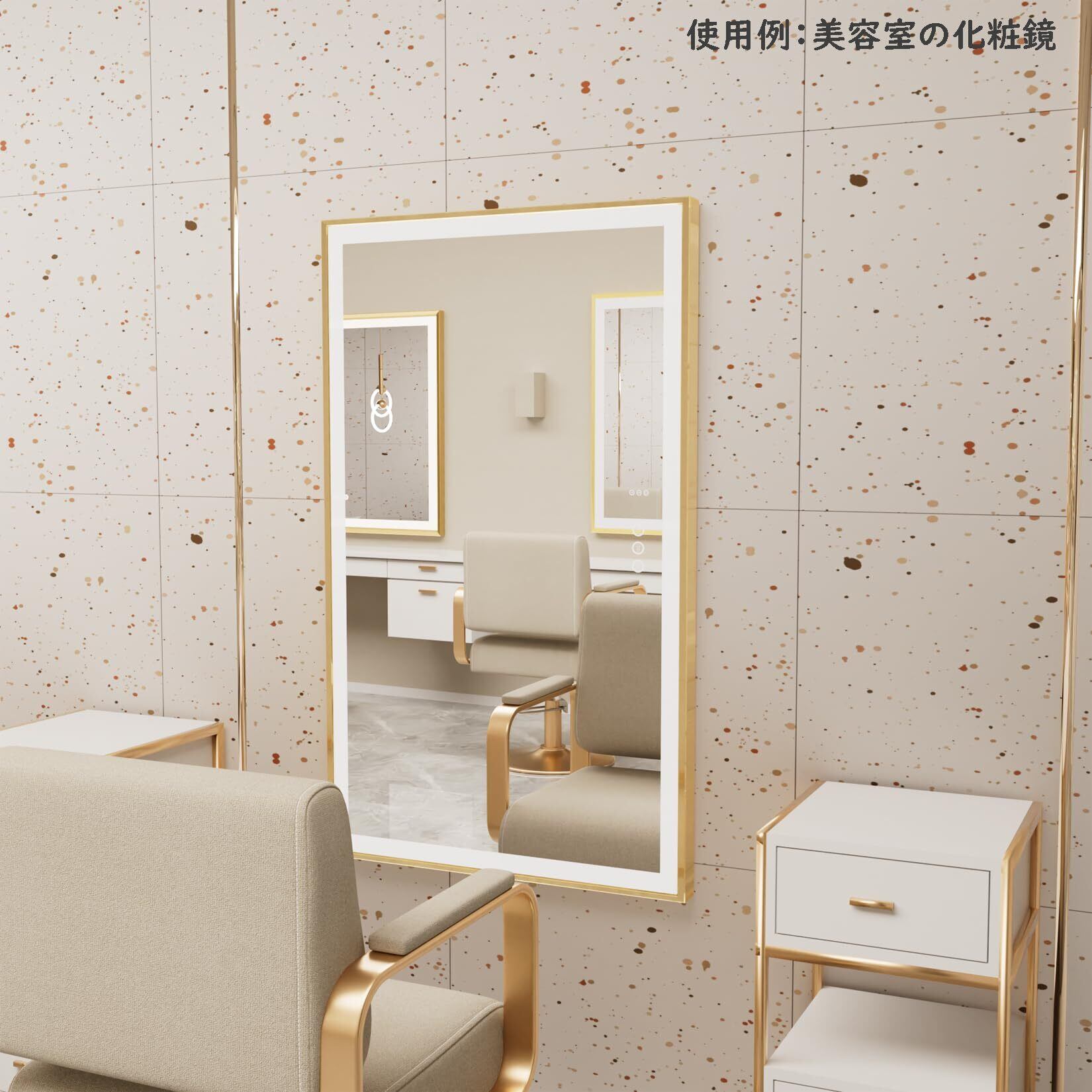 Susire 洗面鏡 壁掛け 全身鏡 100cm×60cm 大きい ledライト付き ゴールドフレーム 照明付き 姿見 玄関 洗面所の鏡 おしゃれ 長方形 横長 美容室 女優ミラー モダン 高級 飛散防止