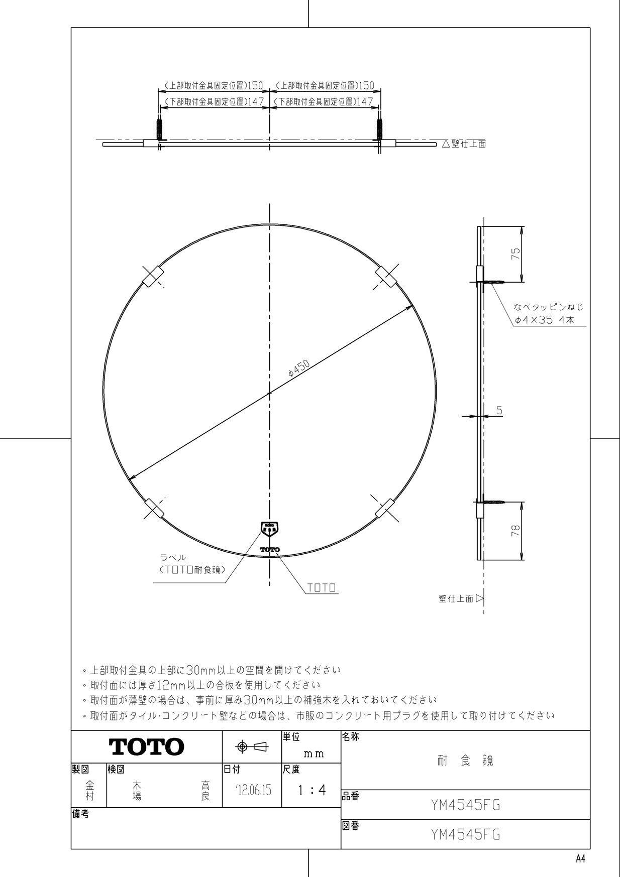 TOTO 耐食鏡 丸形φ450 YM4545FG