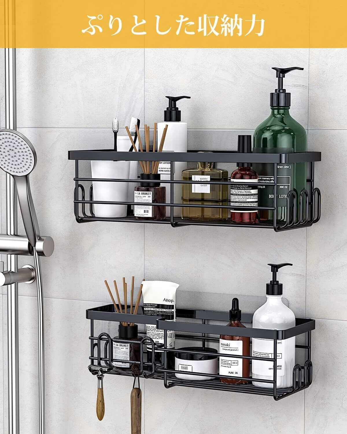 ✿【小物をかけられる便利なフック付き&たっぷりとした収納力】ラックには小物をぶら下げてついでに収納することができるフックが付属しています。ディスペンサーボトル・チューブをまとめて収納、バス用品、お掃除用品、水切りワイパー・ブラシ・スプレー・バズブーツなどの収納にも。おもちゃ入れ 水切れがいいから乾きやすく、おもちゃ収納にも便利。接着面が少ないからぬめりにくくお手入れも簡単