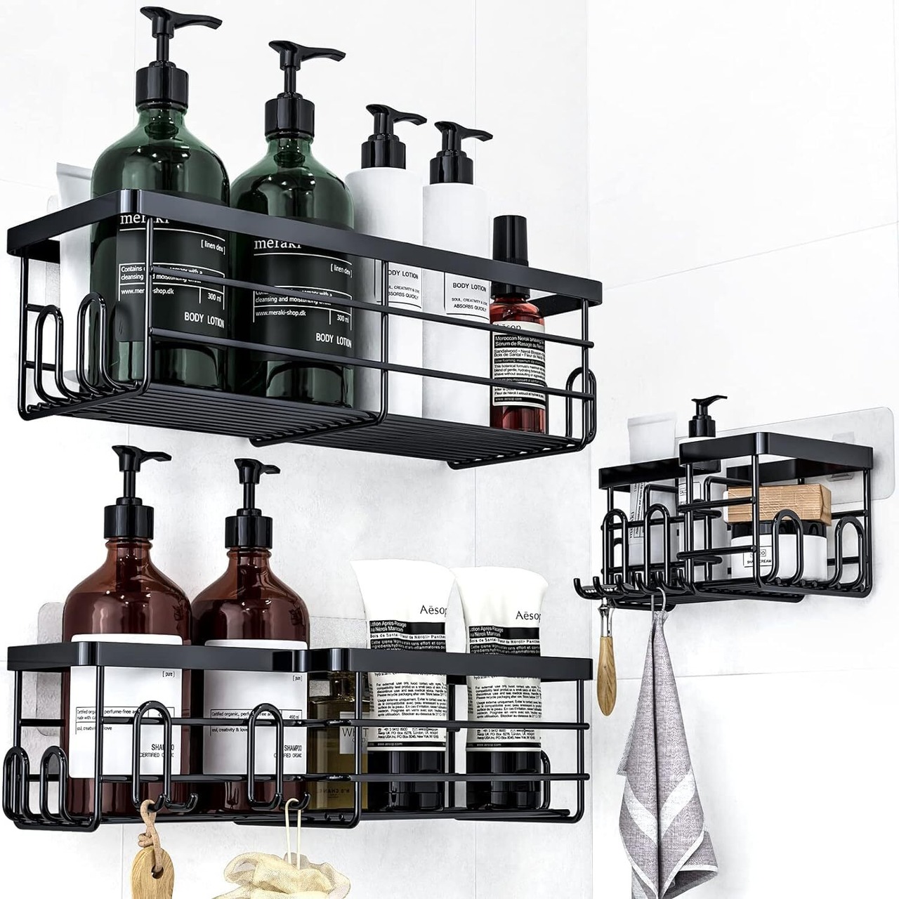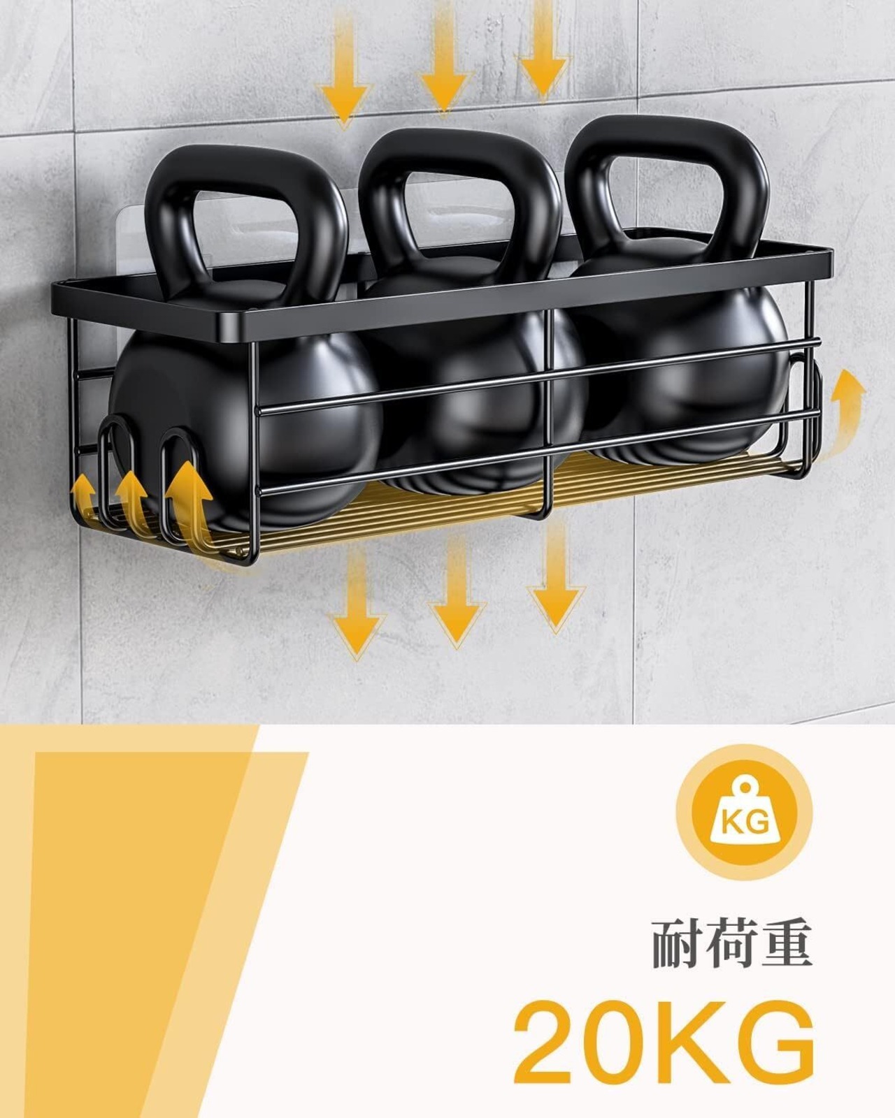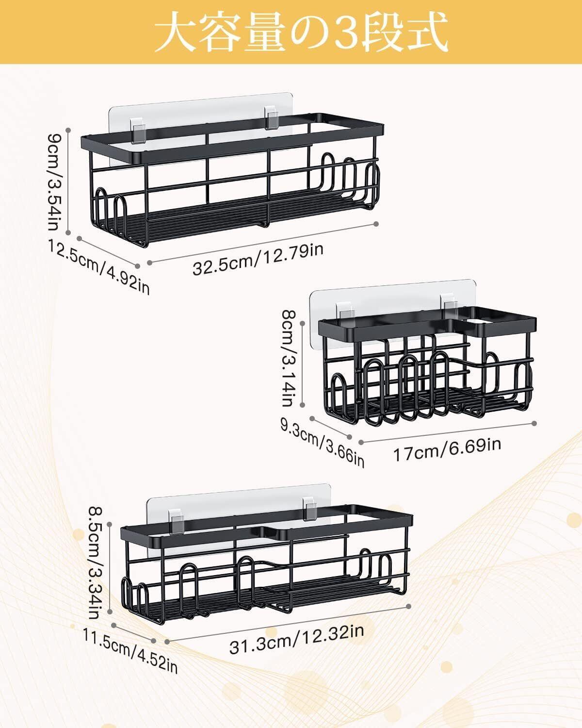 ✿商品サイズ:S:約17cm x 9.3cm x 8cm;M:約31.3cm x 11.5cm x 8.5cm;L:約32.5cm x 12.5cm x 9cm; ▪素材:スチール(粉体塗装) 耐荷重:約20KG ▪パッケージ内容:バスラック本体×3;強力粘着フック×3;ネジ×6;取扱説明書×1, 跡が残らないテープは乾燥した滑らかな表面に貼り付け、棚をテープのフックに掛ける前に 24 時間お待ちください