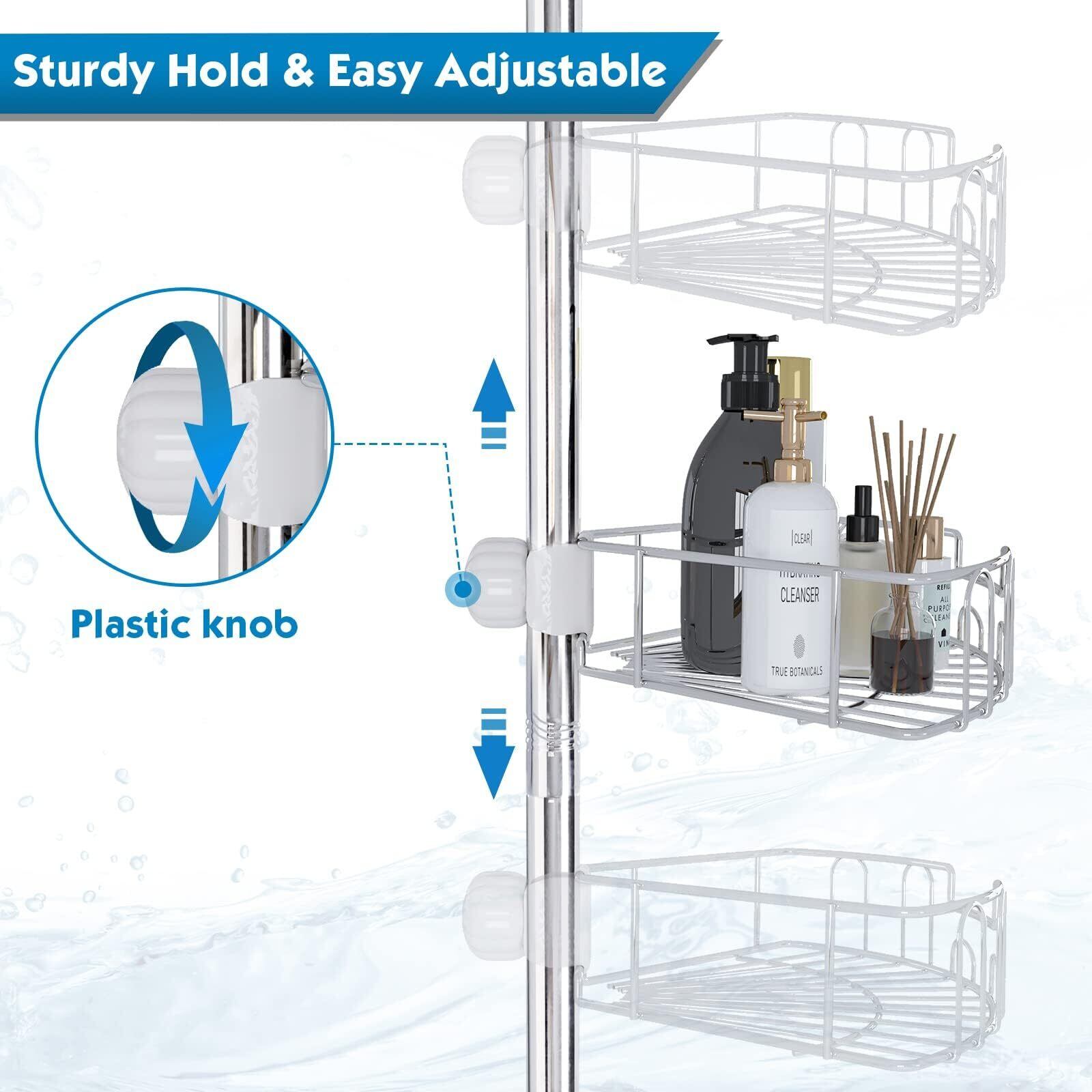 97.5~312.5cmの高さ調節可能 - このテンションコーナーシャワーキャディには、97.5~312.5cmのさまざまな天井の高さに合うように複数のセクションがあります。スプリング式のトップにより、浴槽の端から天井まで、または床から天井まで切断せずに配置できます。