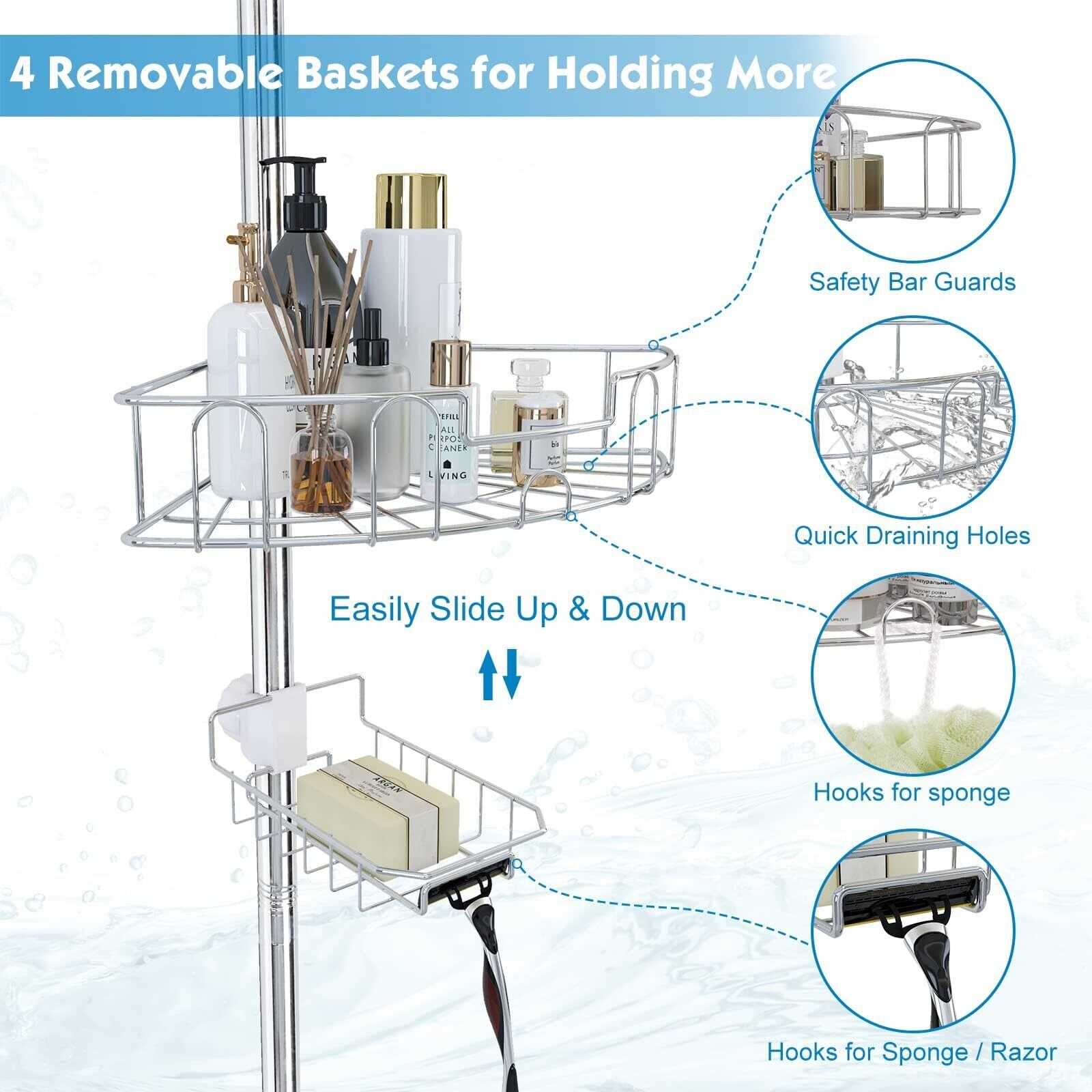 4つのステンレススチール棚 - アップグレードされたステンレススチールバスケットは、液体石鹸、シャンプー、子供用お風呂用おもちゃ、カミソリなど、あらゆるものを収納できる5kgまでの大容量です。カミソリやヘチマ、洗濯物を掛けられる強力な耐荷重フック。
