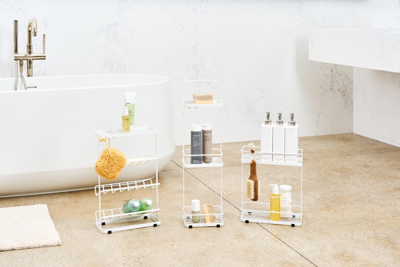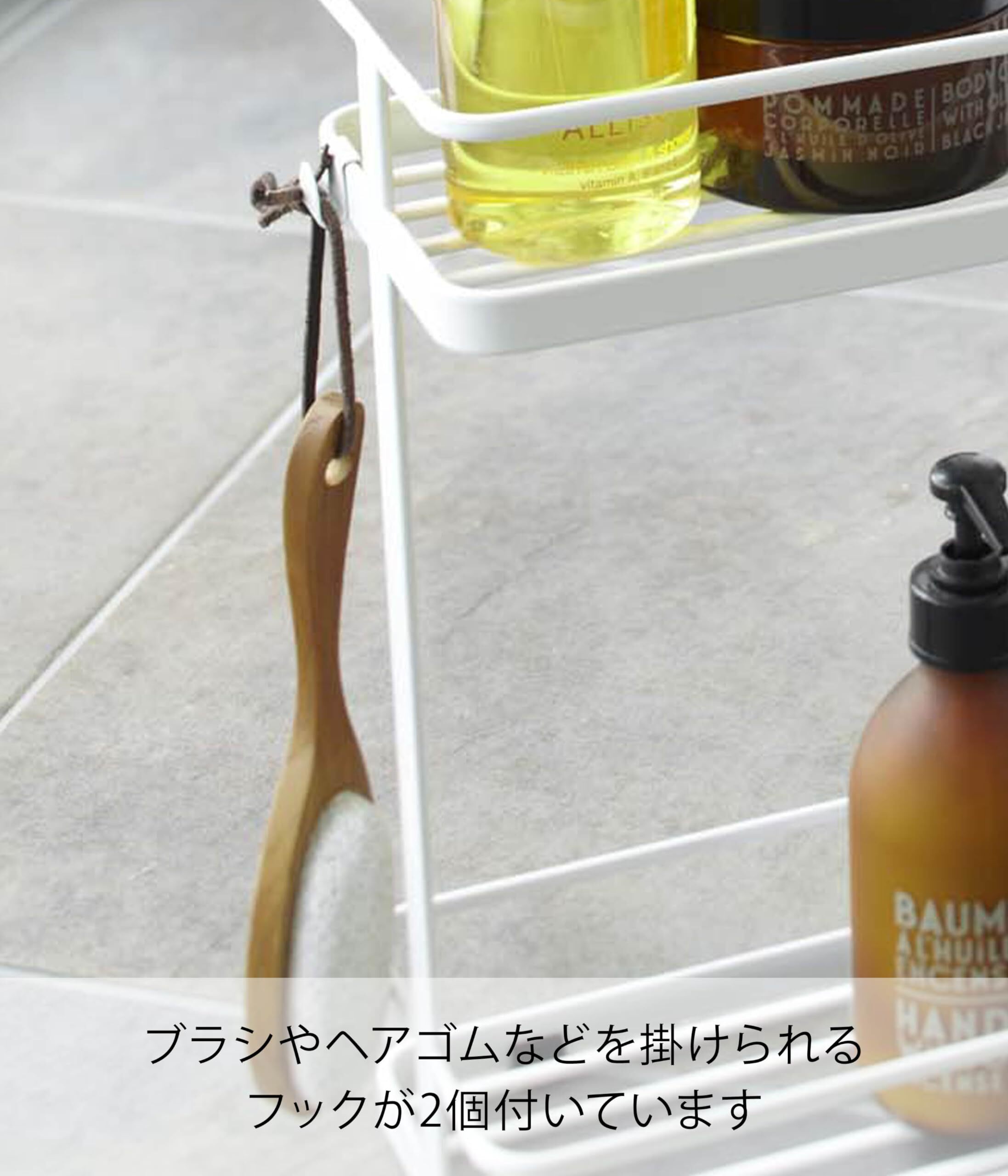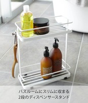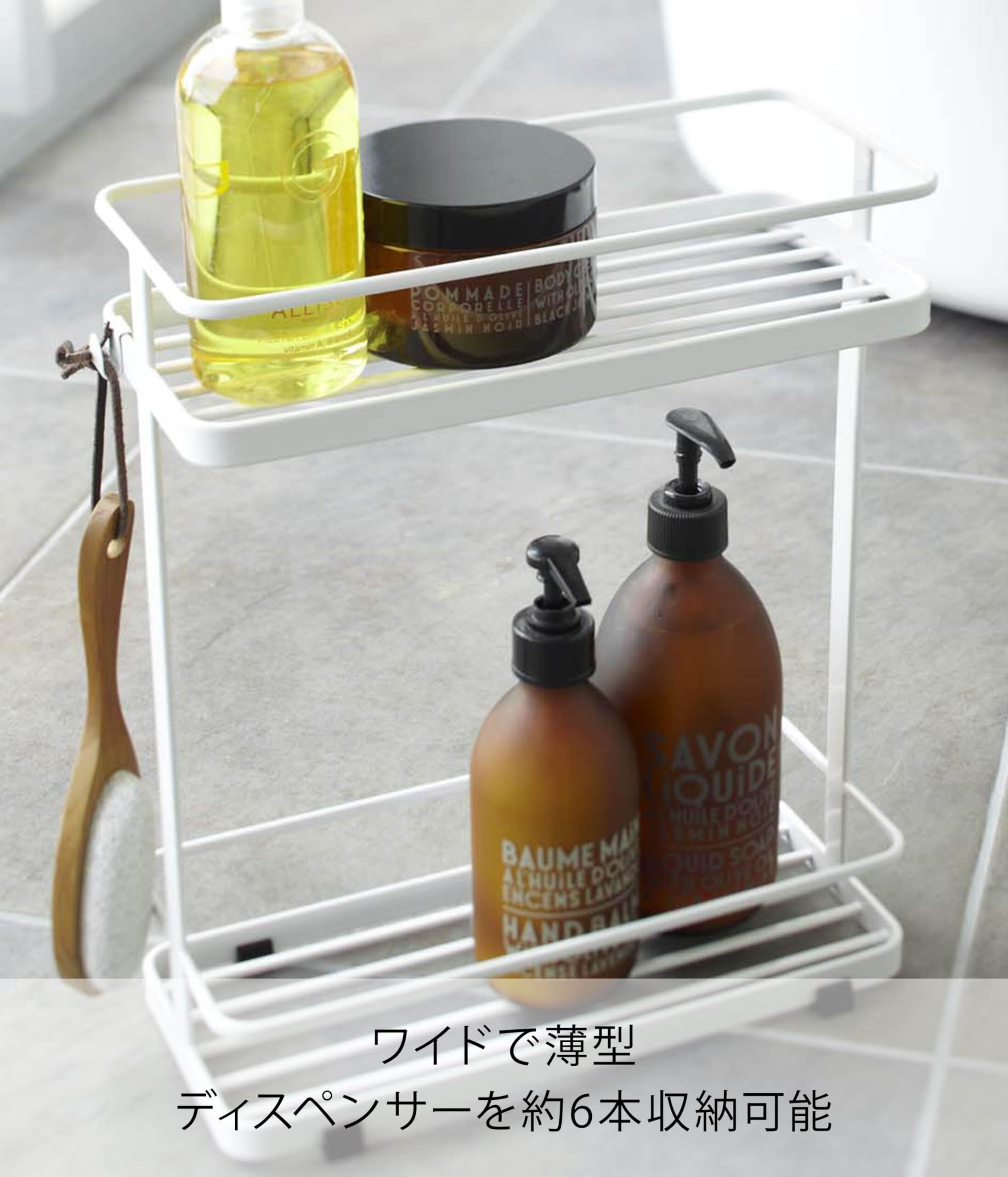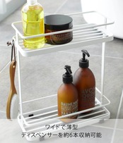 バスルームで圧迫感を感じさせないスタイリッシュなディスペンサースタンド。ワイドでもスッキリ薄型で浴室の角に置いても場所を取らないタテ置きタイプ。安定感もしっかりで6本収納可能。ブラシや輪ゴムなどを引っ掛けられる取り外し式フック付き。