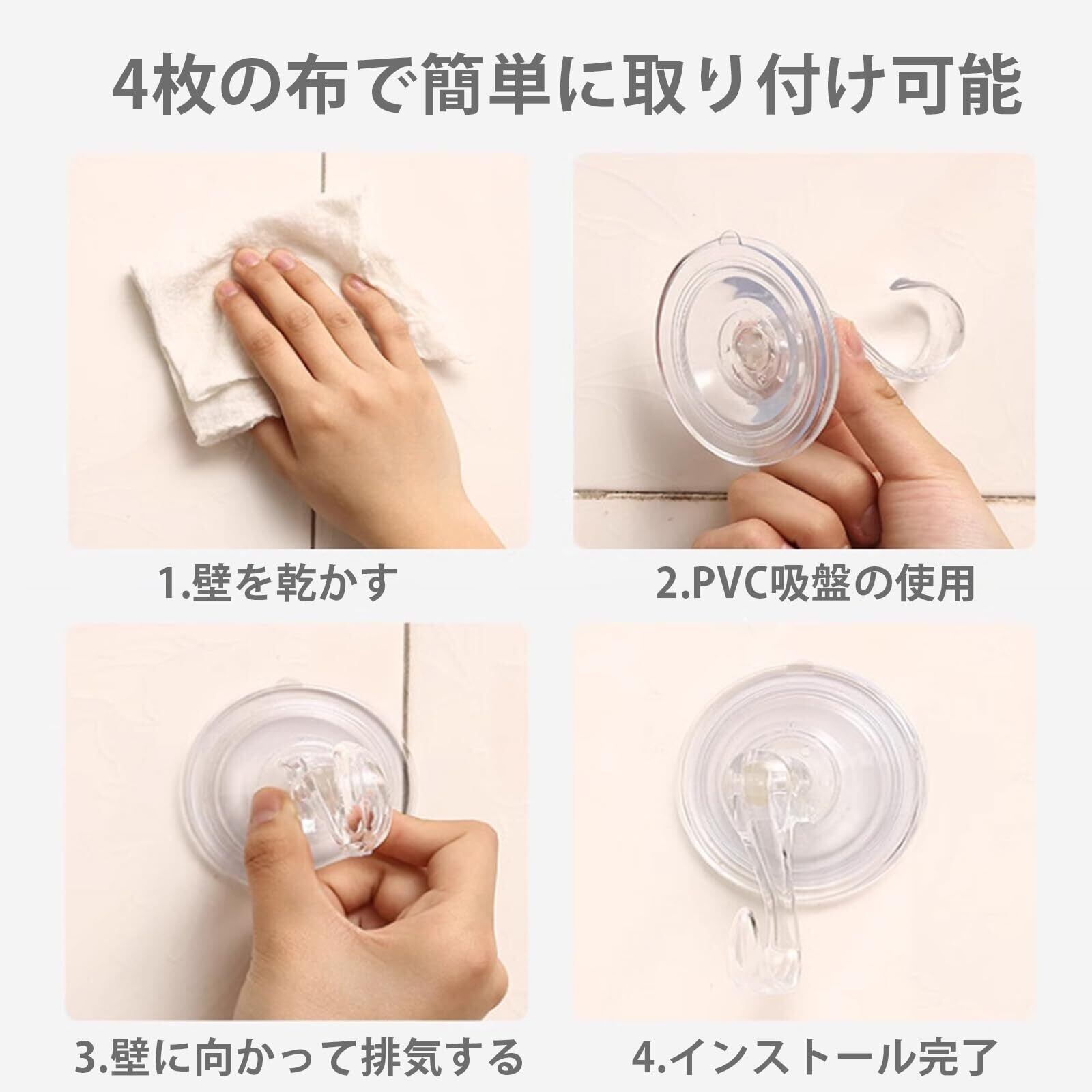 【安全で傷つけない】取り付け方法はとても簡単で、壁に穴を開けたり、接着剤を塗ったりする必要がなく、乾いた壁に吸盤を押し、フックを押すだけで、フック壁 傷つけない。