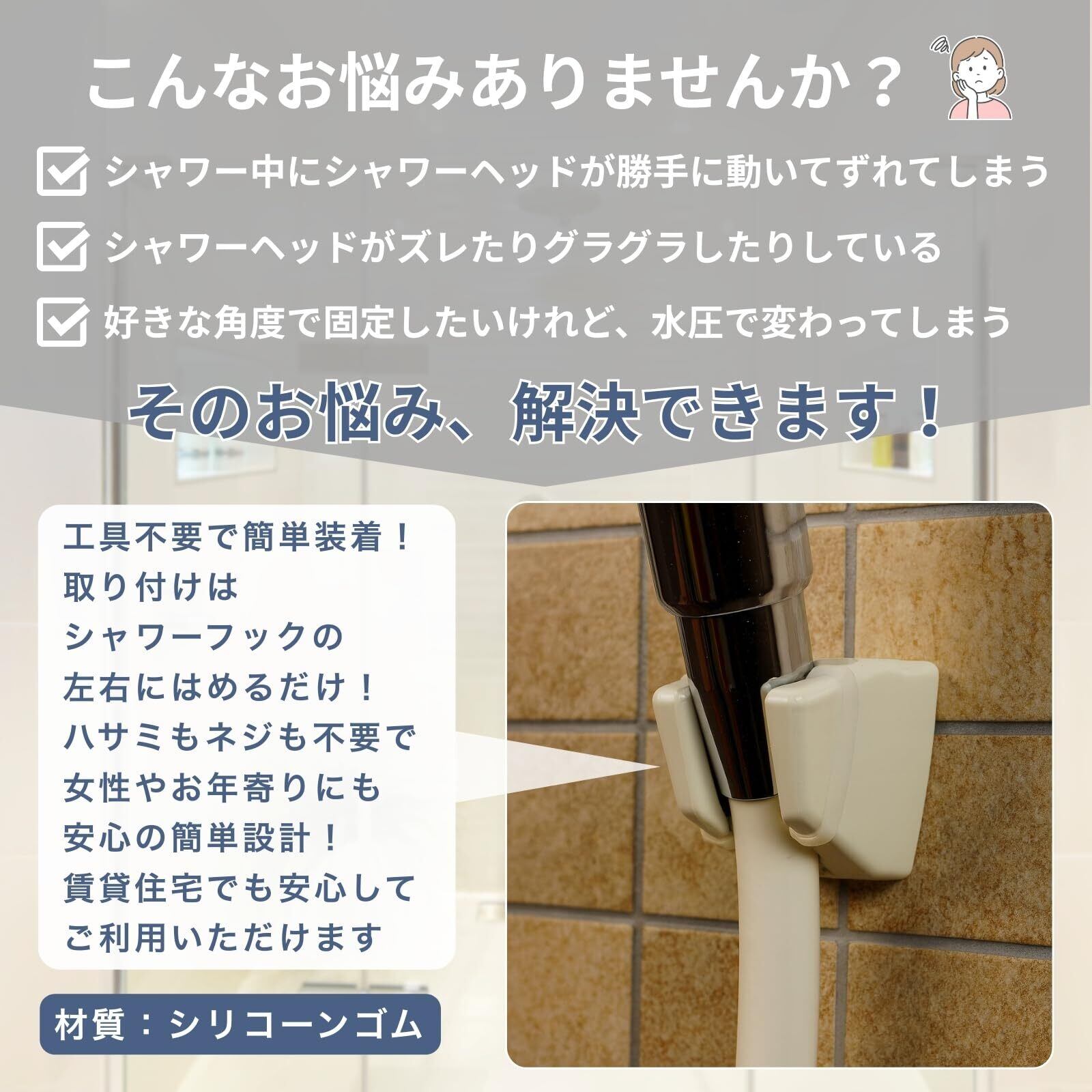 シャワーヘッドが勝手に回って水の向きがズレるストレスを解消!この「シャワーヘッド固定ゴム」は、回転を防ぎ、ちょうど良い角度でしっかり固定できます。3サイズ×各2個入りで、多くのシャワーヘッドやホースに対応。工具不要で簡単に取り付けられ、ゴム製なのでしっかりフィットしながらも着脱ラクラク。日々のバスタイムを快適にしたい方におすすめです。