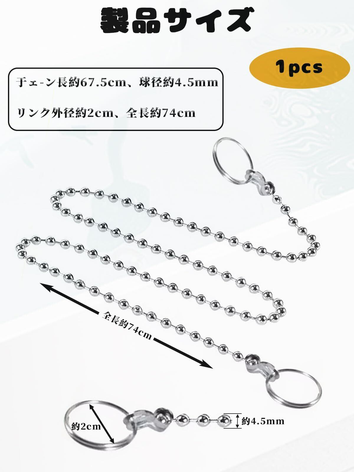 【製品サイズ】全長約74cm、チェーン長さ約67.5cm、玉径約4.5mm、リンク外径約2cm。