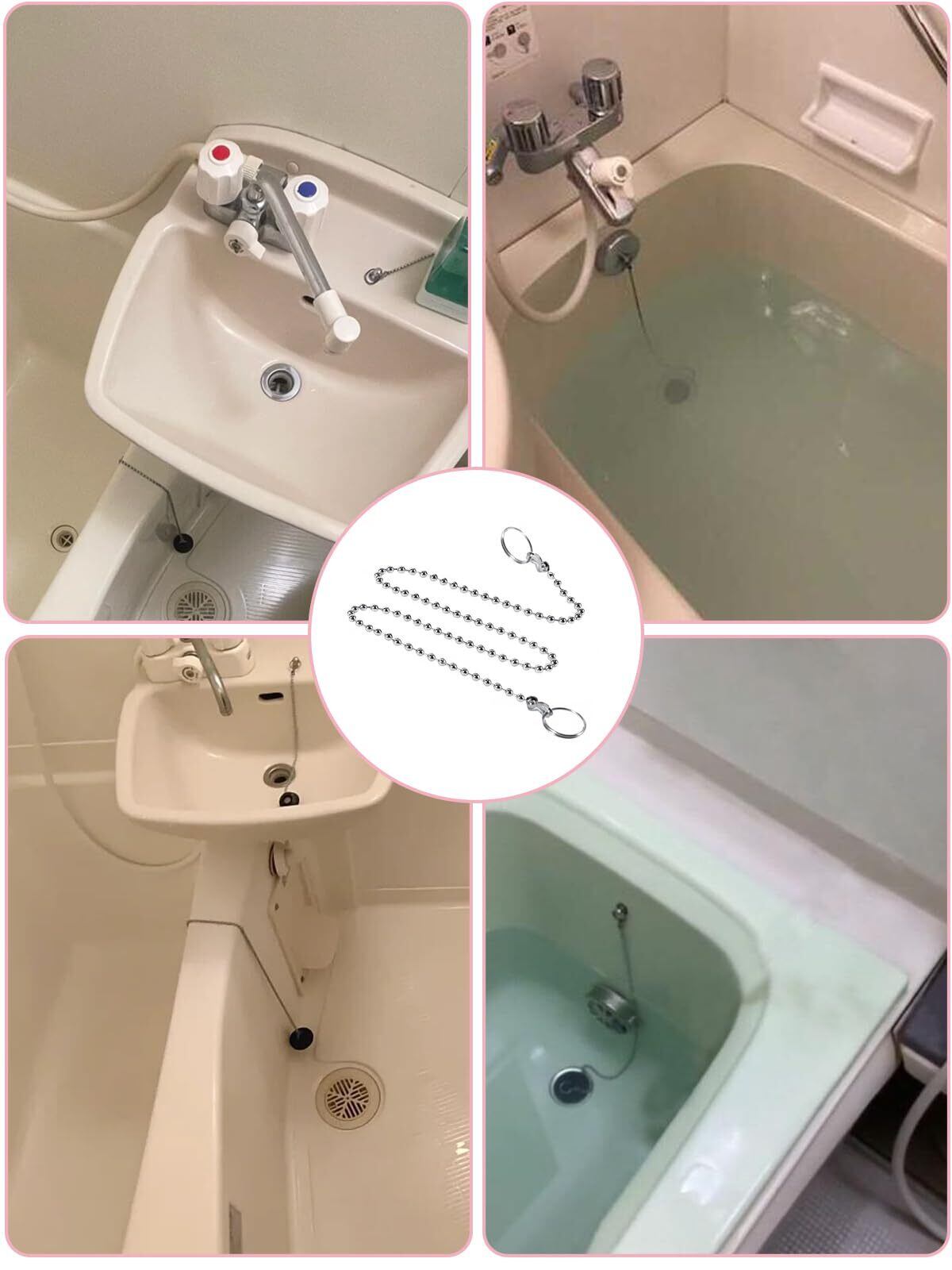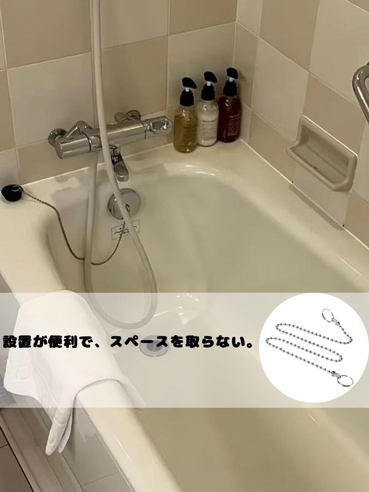 【紛失防止ステンレスチェーン設計】チェーンの両端に二重環がありは浴槽栓と排水口にしっかりと接続でき、栓の脱落や紛失を防止し、ワンタッチで引っ張ることができ、排水がより便利で、使用がより安心できる。軽量化設計を採用し、使用しないときはチェーンをフックに簡単にぶら下げることができ、スペースを節約し、取りやすい。