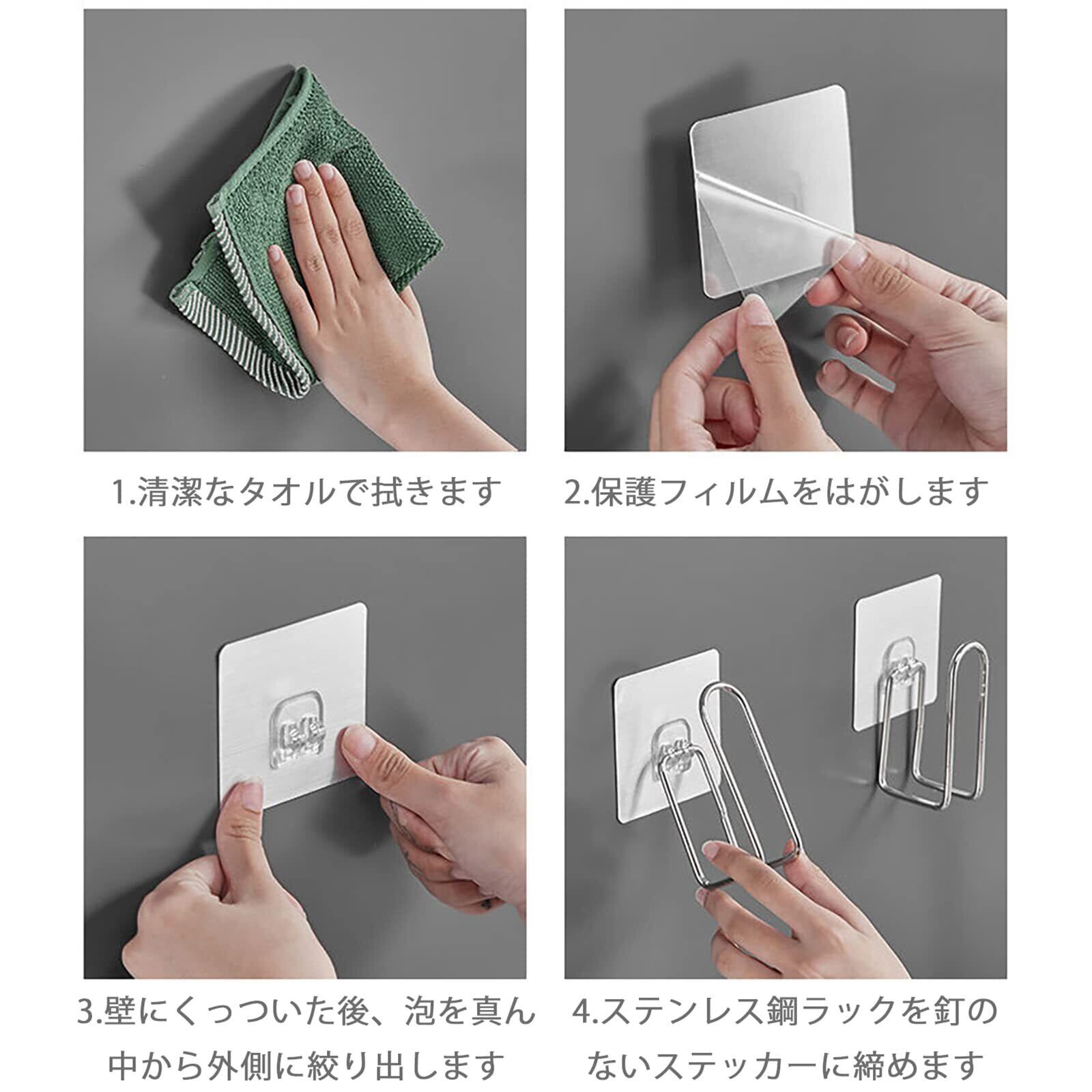 貼り付け方法ーマジックシートフック仕様なので穴開け不要で何度でも貼り付け、剥がすことができます。マグネットではないので、タイルなど壁面に磁石がつかない場所でも使用できます。※マジックシートフックの耐荷重は10kg。防水性も兼ね備えているため、水によって落ちたりする心配もありません。