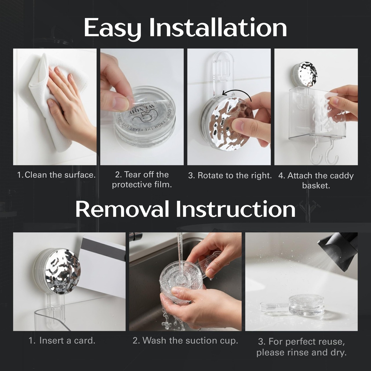 再利用可能で取り外しも簡単。損傷や残留物を残さずきれいに剥がせます。 吸盤ベースの下にカードや平らなものを挿入し、温水ですすぎ、必要に応じて再利用するだけです。