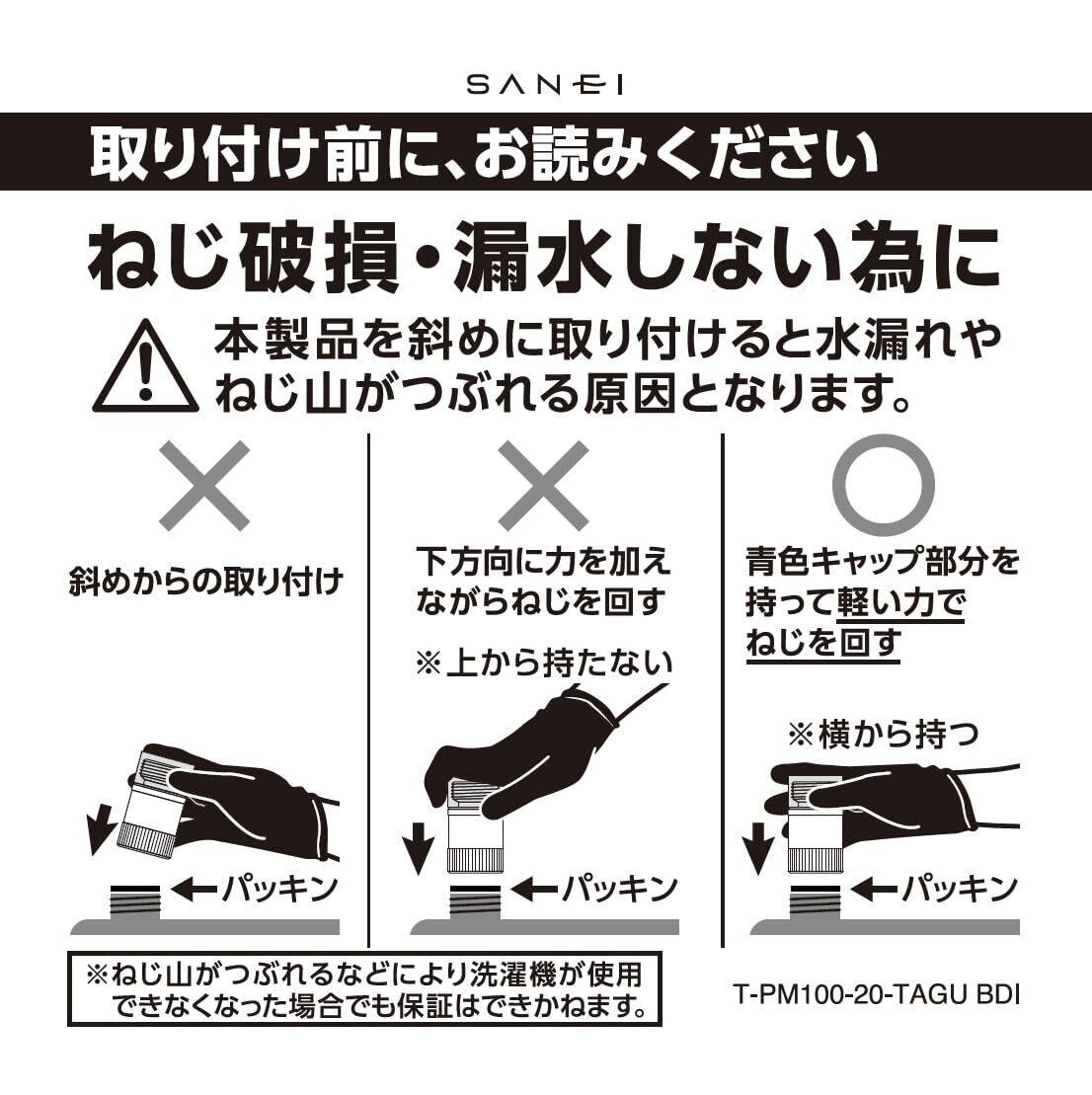 ※他社製ホースの仕様によっては、ホース接続部より水モレする場合があります。またお使いの洗濯機ホースに曲がり癖がついている場合、アダプターに横からの力が加わり、水モレにつながる可能性があります。そういった場合はSANEI製の洗濯機ホースを購入し、交換して下さい。また以下のような取り付け方は水もれやねじ山がつぶれる原因になりますので使用前によくご確認下さい。➀アダプターが洗濯機側に対し斜めに取り付け➁ホース口が斜めに取り付け➂洗濯機の給水口に破損や変形がある *ねじ山がつぶれるなどにより洗濯機が使用できなくなった場合でもはできかねます。