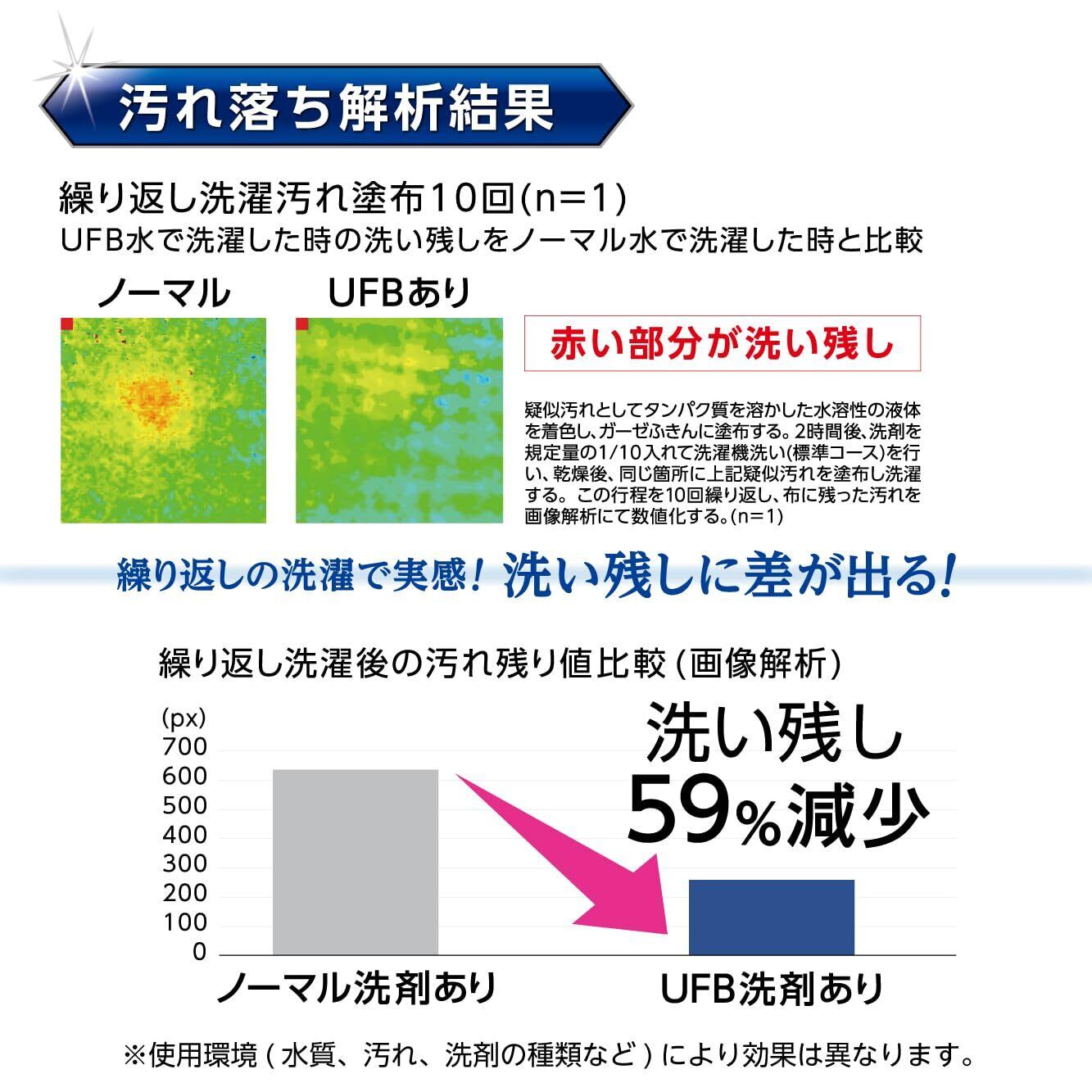【繰り返しの洗濯で実感!洗い残しに差が出る。】ノーマル水での洗濯に比べ、ウルトラファインバブル水は59%洗い残し減!※疑似汚れとしてタンパク質を溶かした水溶性の液体を着色し、ガーゼふきんに塗布。2時間後、洗剤を規定量の1/10入れて洗濯機洗い(標準コース)を行い、乾燥後、同じ箇所に上記疑似汚れを塗布し洗濯。この工程を10回繰り返し、布に残った汚れを画像解析にて数値化し検証。