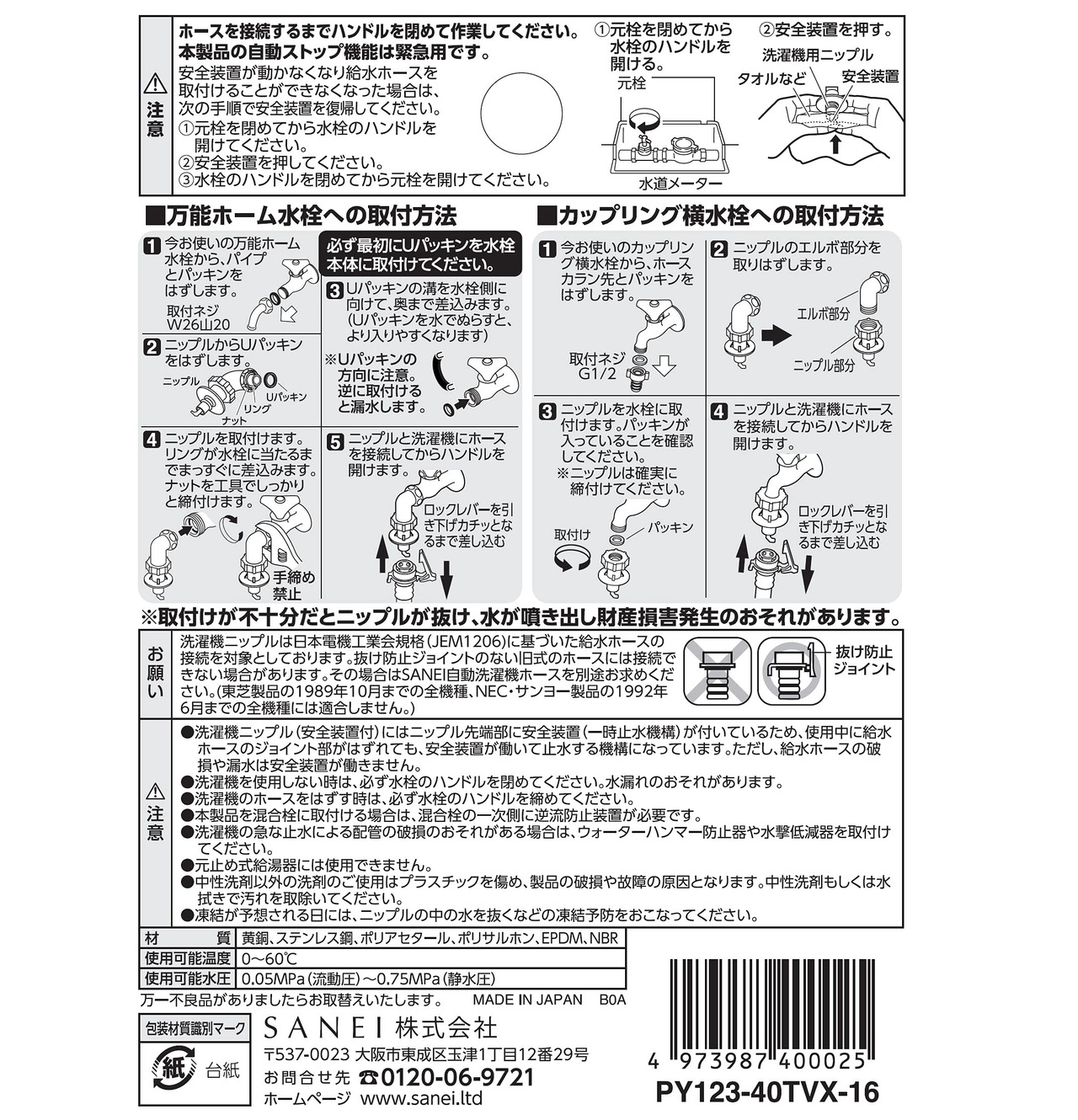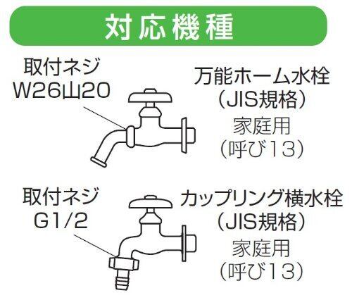 洗濯機ホースを接続するニップルオートストップ機能付で万一ホースが外れた場合、瞬時に給水を自動停止万能ホーム水栓・カップリング横水栓のどちらにも取り付け可能