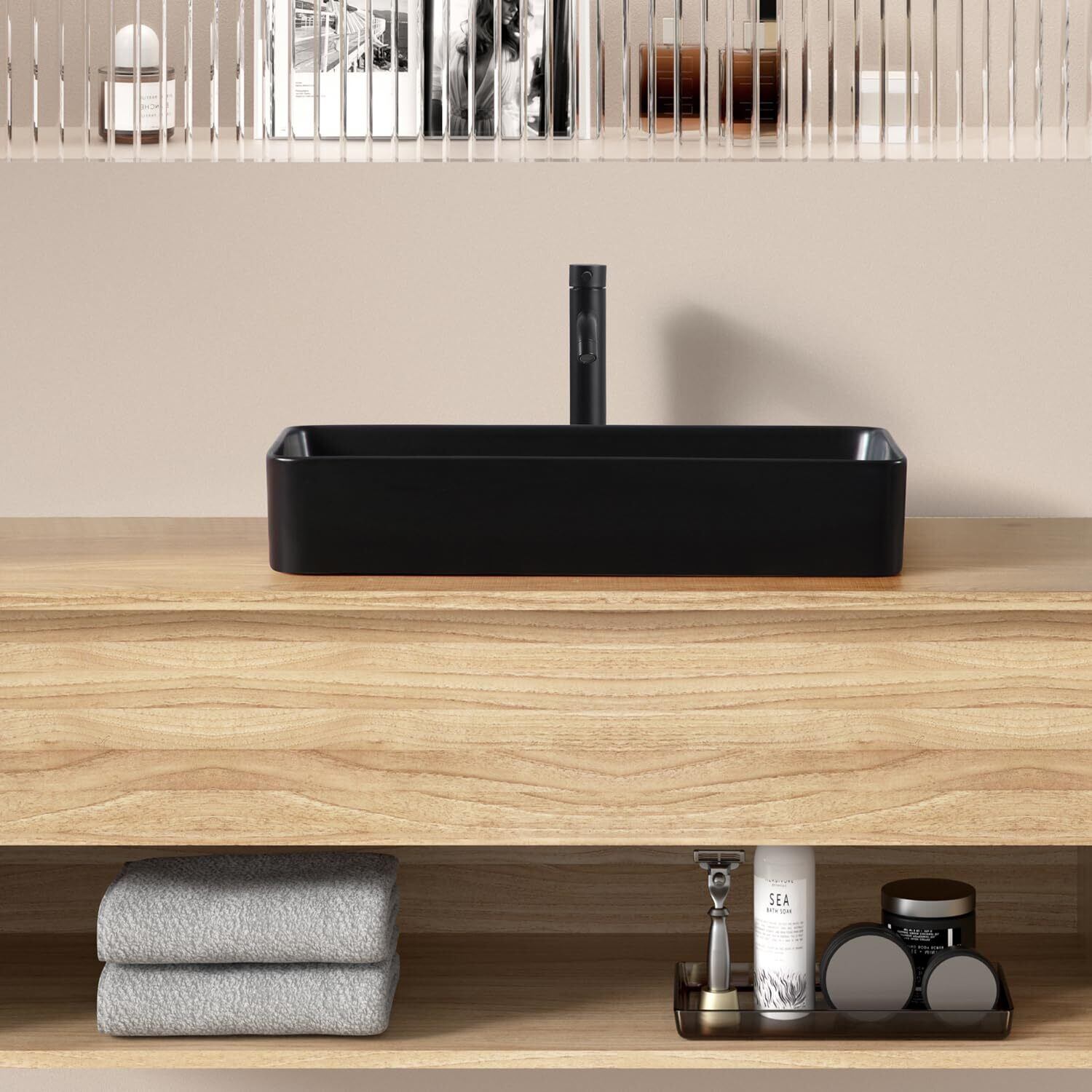 【JOMOWN限定排水セット付き】 おしゃれ 洗面ボウル 大型 洗面ボール 洗面台 置き型 陶器製 手洗いボウル 洗面鉢 605*355*110mm (長方形)