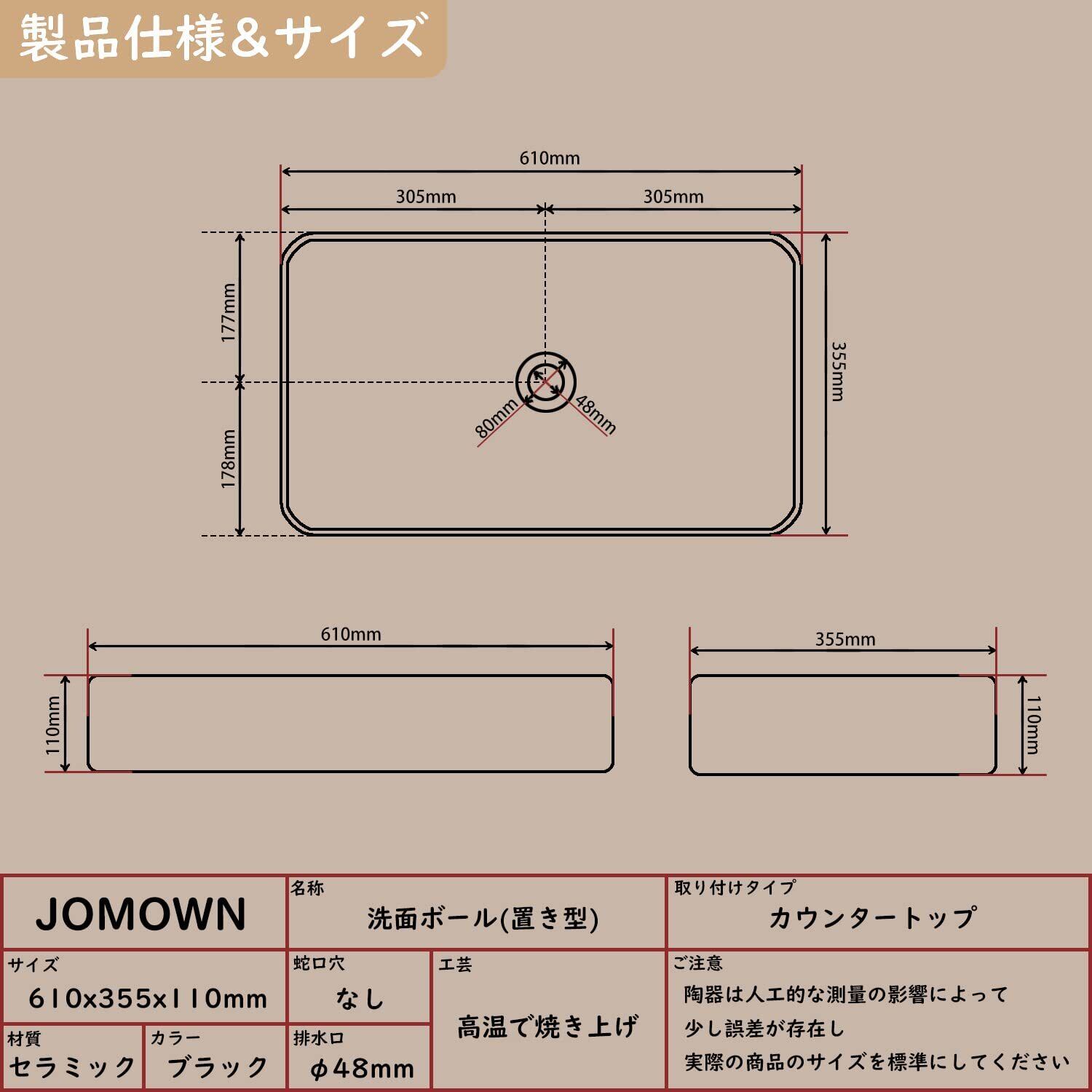 【高品質&掃除しやすい】:JOMOWNの手洗器は1280℃以上の高温で焼き上げております。 伝統工芸とモダンのデザインを組み合わせる黒い洗面ボウルは洗面所の全体が清潔でシャープな印象を残しやすいです。洗面器の表面には釉薬が採用して、滑らかで光沢があります。表面が滑らかで汚れが溜まりにくいので、サッとふくだけで、きれいになります。