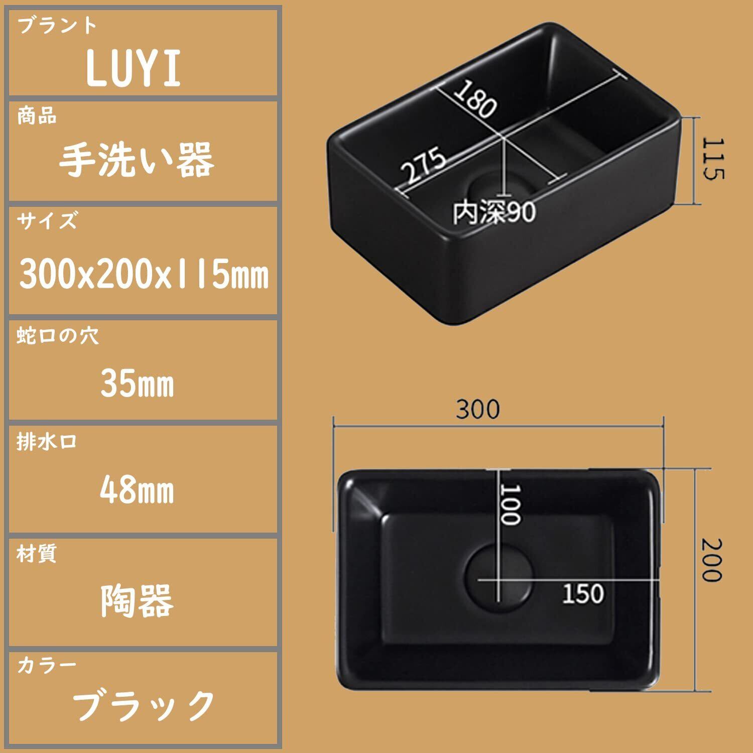 【商品サイズ&設置説明】:洗面器のサイズ:300*200*115mm、重さ:6.5kg、排水口径:48mm。蛇口の取り付け穴径:35mm、水栓の取り付けホースの規格:G1/2ナッツ(21mm)。 この手洗いボウルはホテル、家、会社、ビル、浴室、トイレなどに適用します。商品は設置が簡単なので、日本語取扱説明書どおりに設置すればでいいです。オシャレなデザインを与えています。