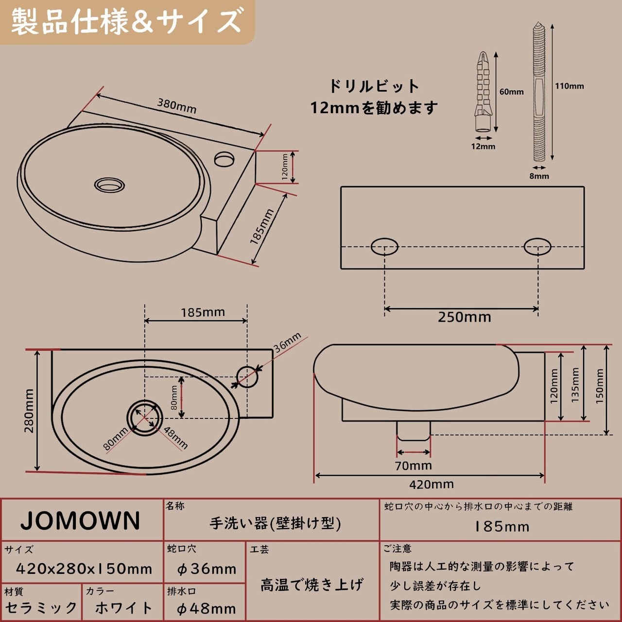 【規格&取り付け説明】:小型洗面ボウルのサイズ:425*285*150mm、重さ:8kg、排水口径:48mm。蛇口の取り付け穴径:36mm、取り付けホースの規格:G1/2ナッツ(φ21mm)、ドリルビットは12㎜を勧めます。 この洗面シンクはホテル、家、会社、ビル、キッチン、浴室、トイレなどに適用します。洗面ボウルと排水金具は設置が簡単なので、取扱説明書どおりに設置すればでいいです。おしゃれなデザインを与えています。