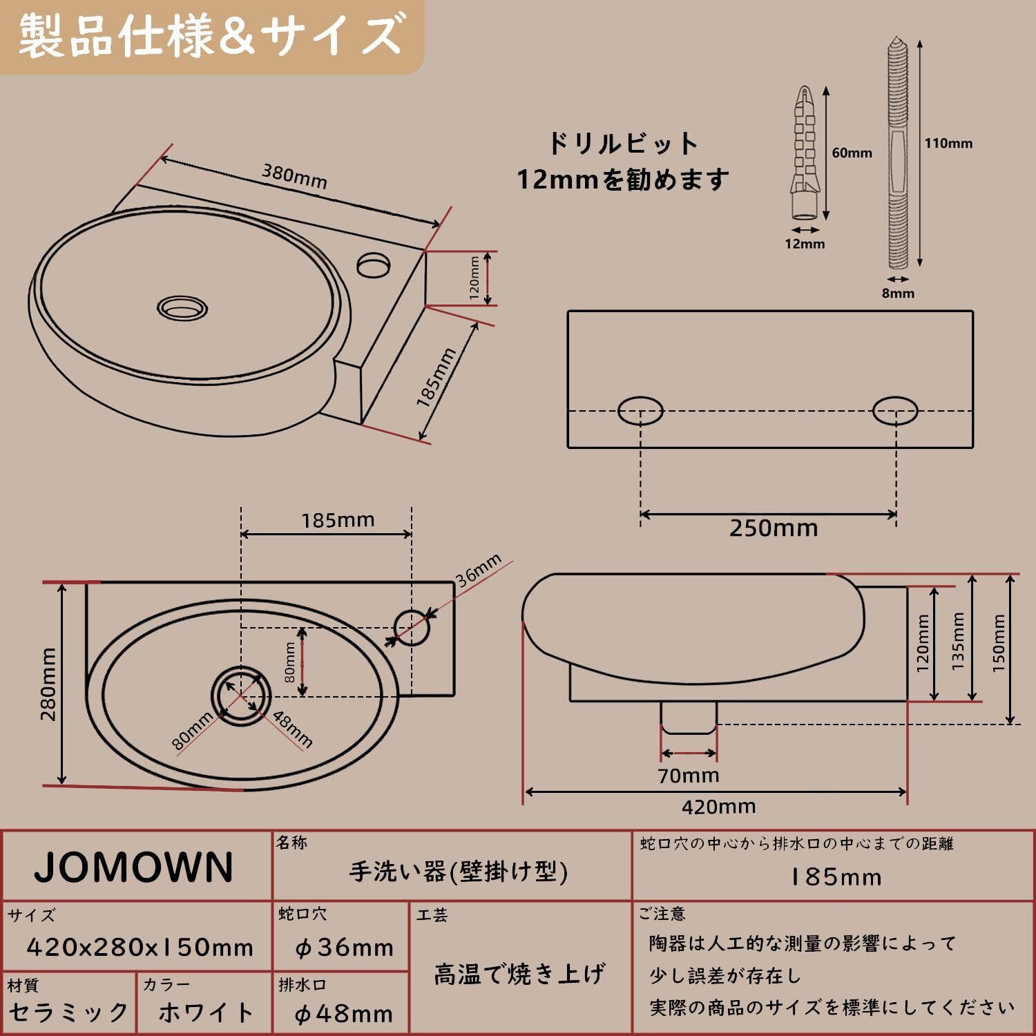 【高品質&掃除しやすい】:JOMOWNの手洗い器は1280℃以上の高温で焼き上げております。 伝統工芸とモダンのデザインを組み合わせる白い手洗ボウルは洗面所の全体が清潔でシャープな印象を残しやすいです。手洗器の表面には釉薬が採用して、滑らかで光沢があります。表面が滑らかで汚れが溜まりにくいので、サッとふくだけで、きれいになります。