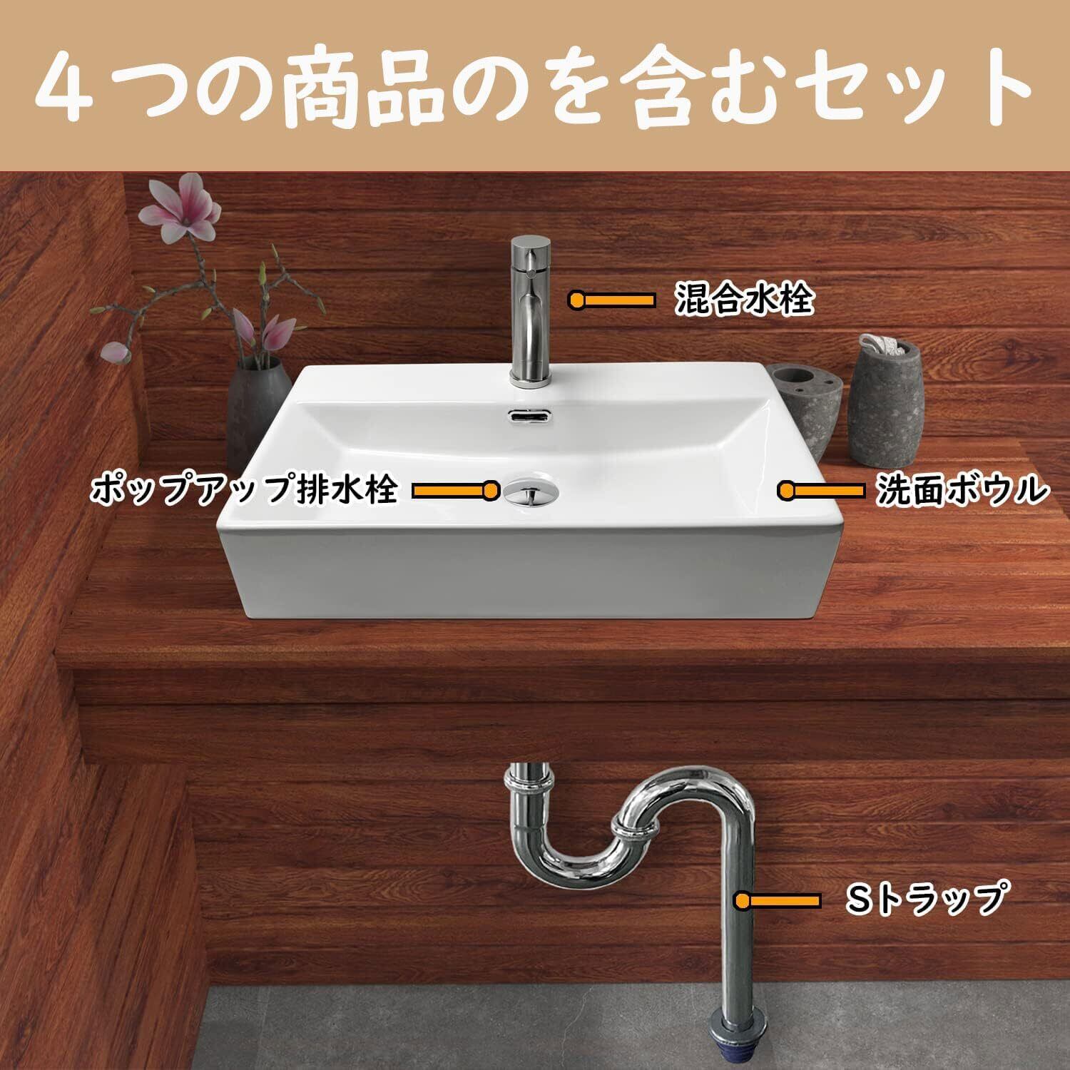 【高級Sトラップセット付き】 洗面ボウル 置き型 洗面台 大型 605*360*130mm おしゃれ 洗面ボール 陶器 手洗い器 手洗いボウル 蛇口セット (長方形)