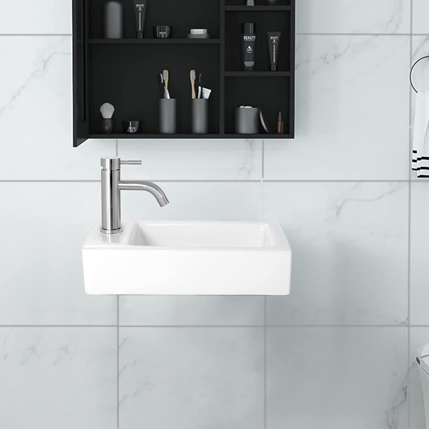 壁付け型 陶器製 小さなトイレに適し洗面器 蛇口 水栓&排水金具付き 和風 洋風 壁掛け おしゃれ シンプル 洗面台 キッチン用水栓 混合水栓 (右側洗面器+蛇口)