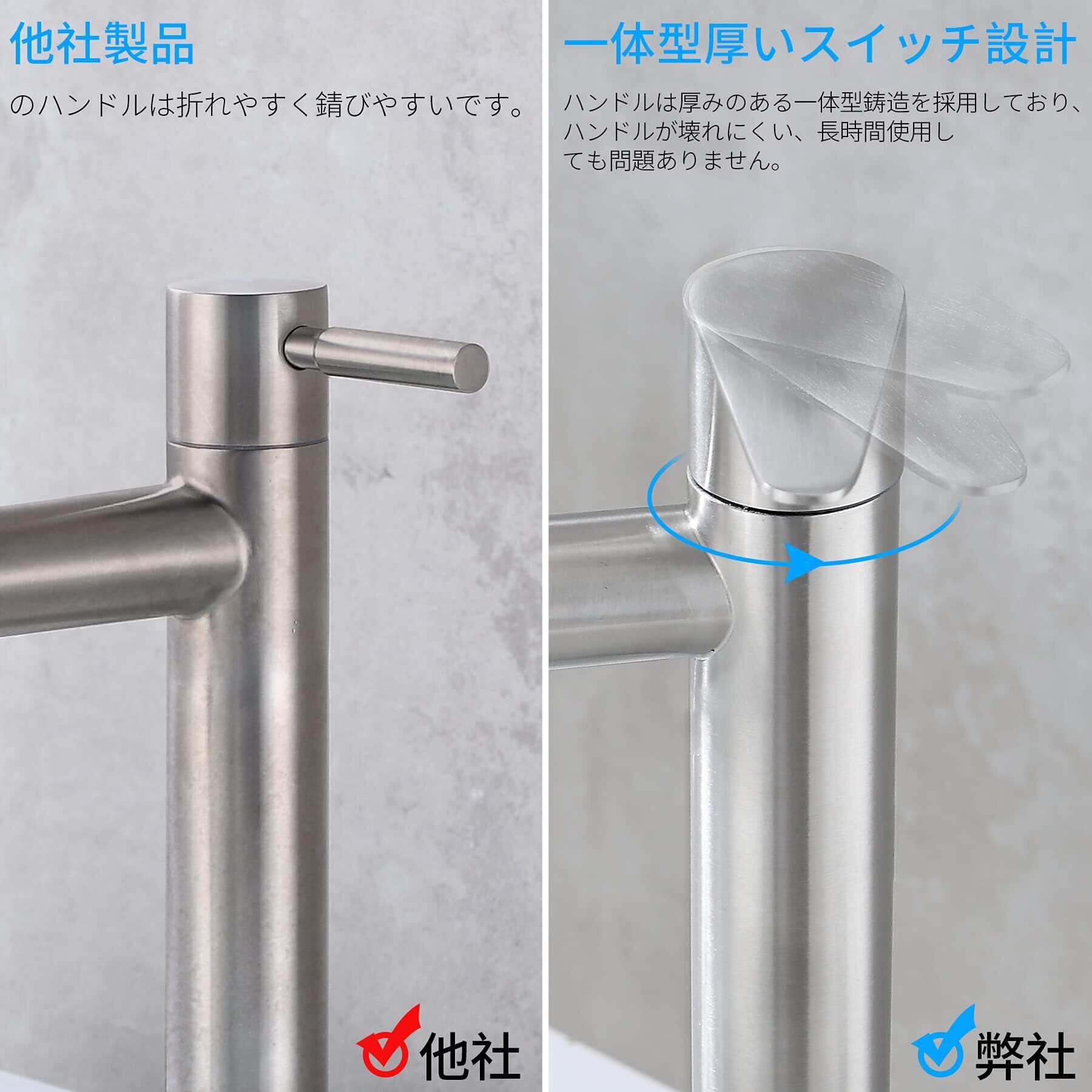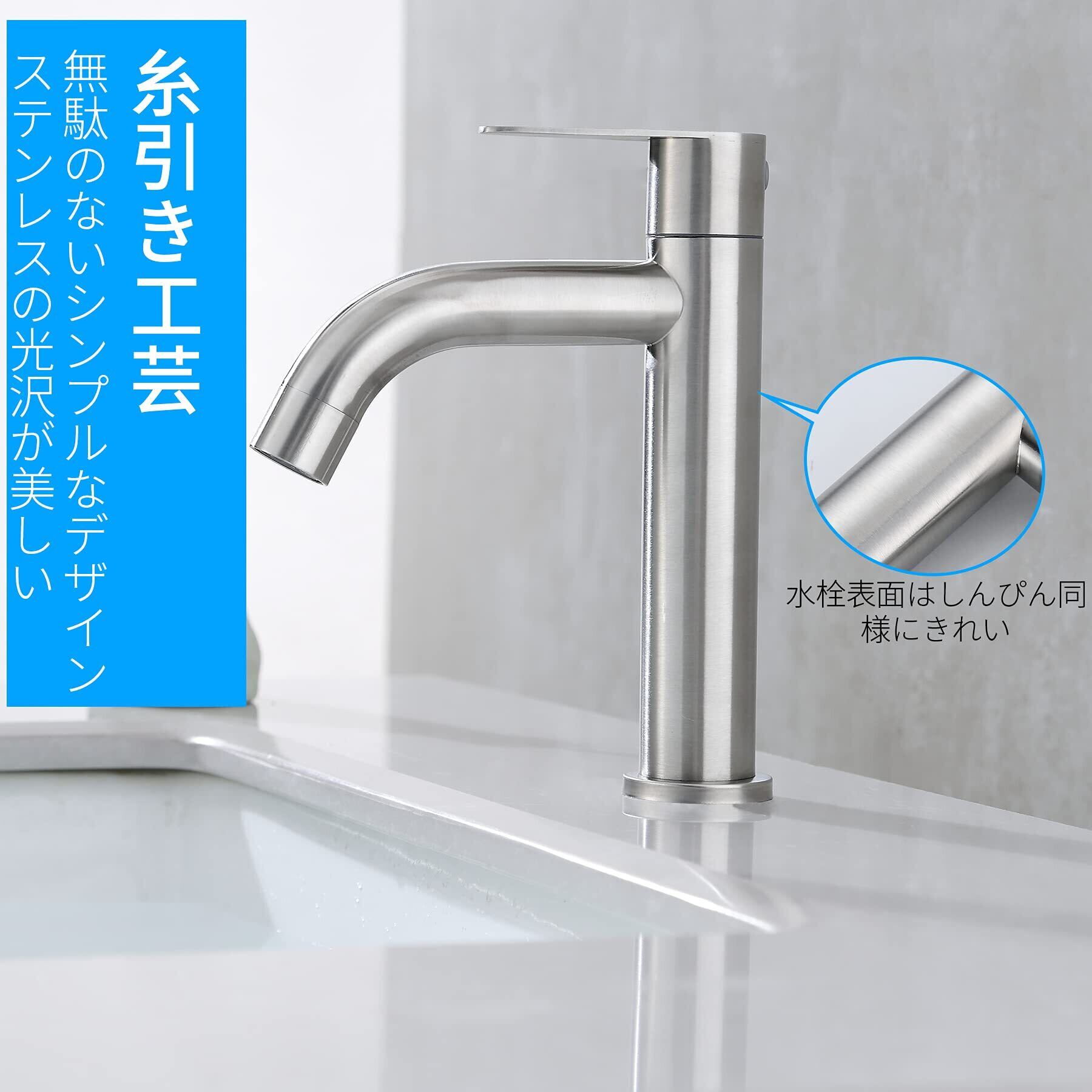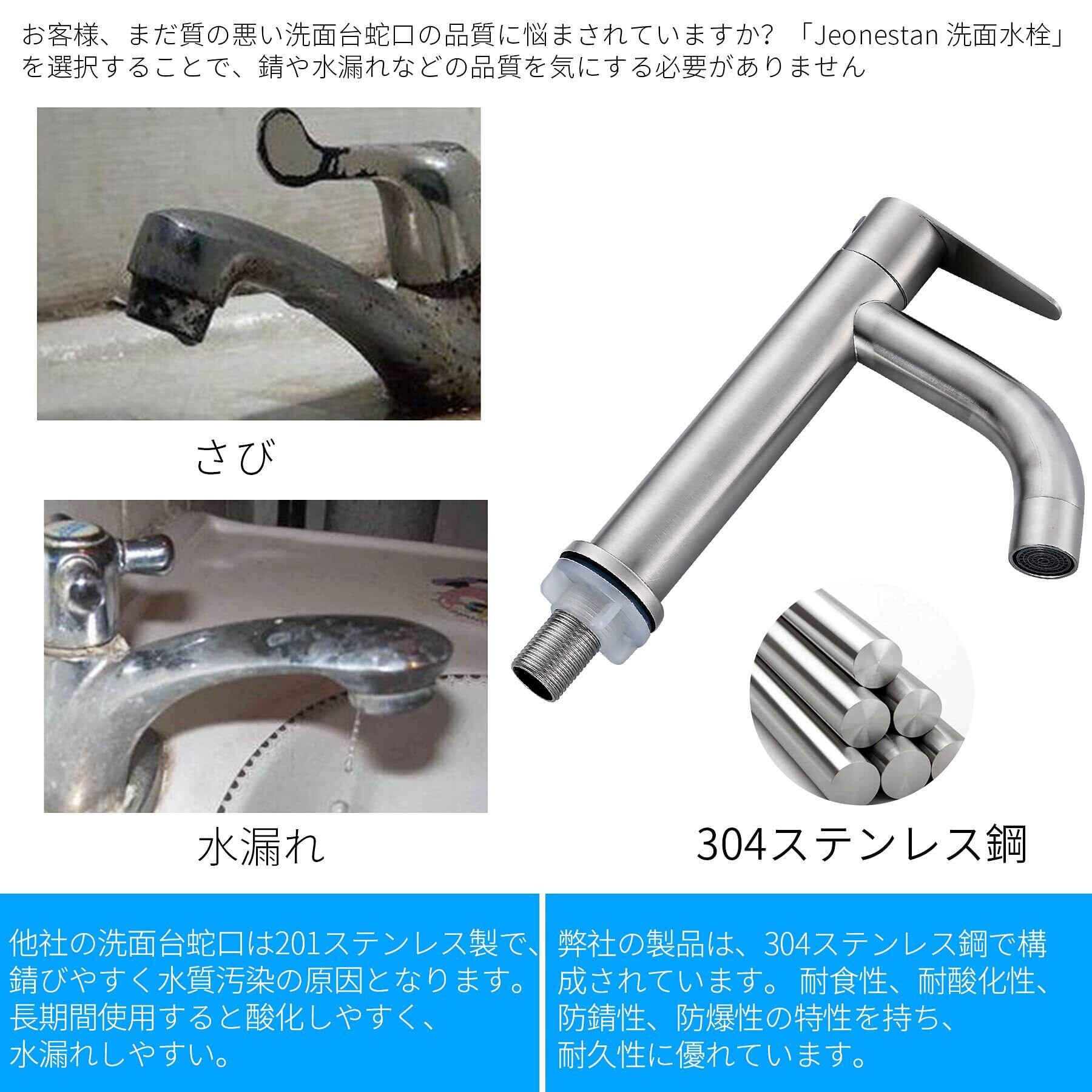 【304ステンレス鋼材質&耐久性が良く】Jeonestan洗面水栓は304ステンレス鋼材料が採用し、糸引き工芸でさびを効果的に防げて、耐久性が向上しています。蛇口を変えただけでも気分一新、毎日の生活も楽しくなってくると思います。古い蛇口から交換しようと思っている方にお勧めです。