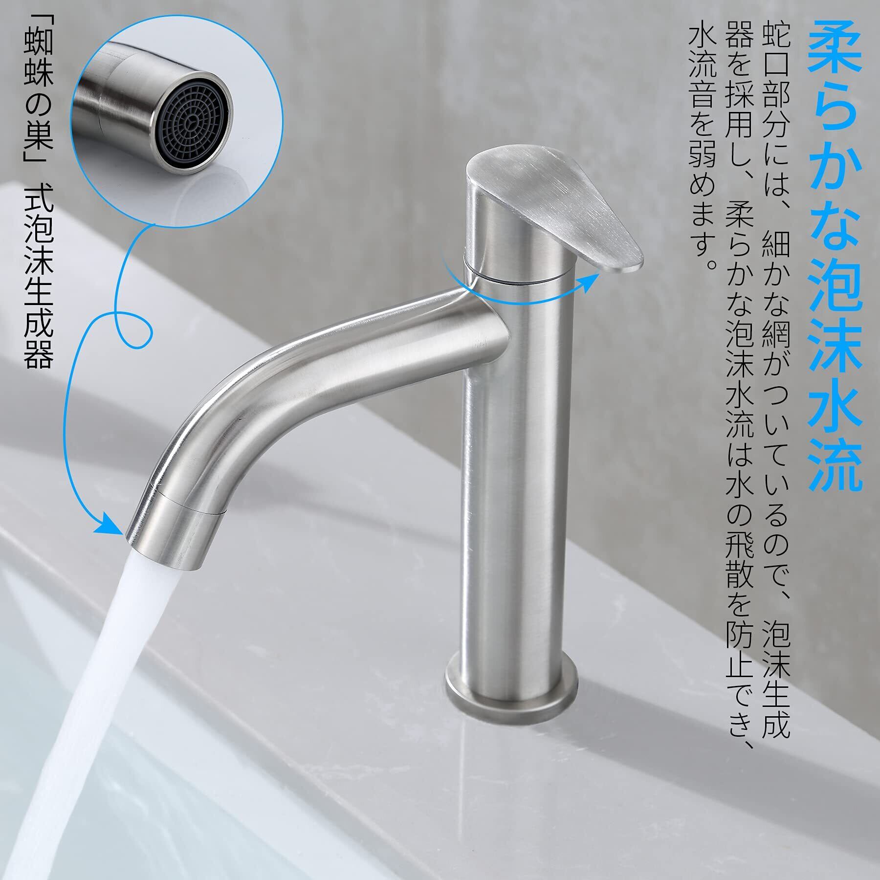 【泡沫生成器&飛沫なし】洗面台水栓の注ぎ口は泡沫生成器を採用し、柔らかな泡沫水流は水の飛散を防止でき、水流音を弱めます。シンプルでオシャレなとても使い勝手の良いステンレス製のシングルレバー立水栓です!