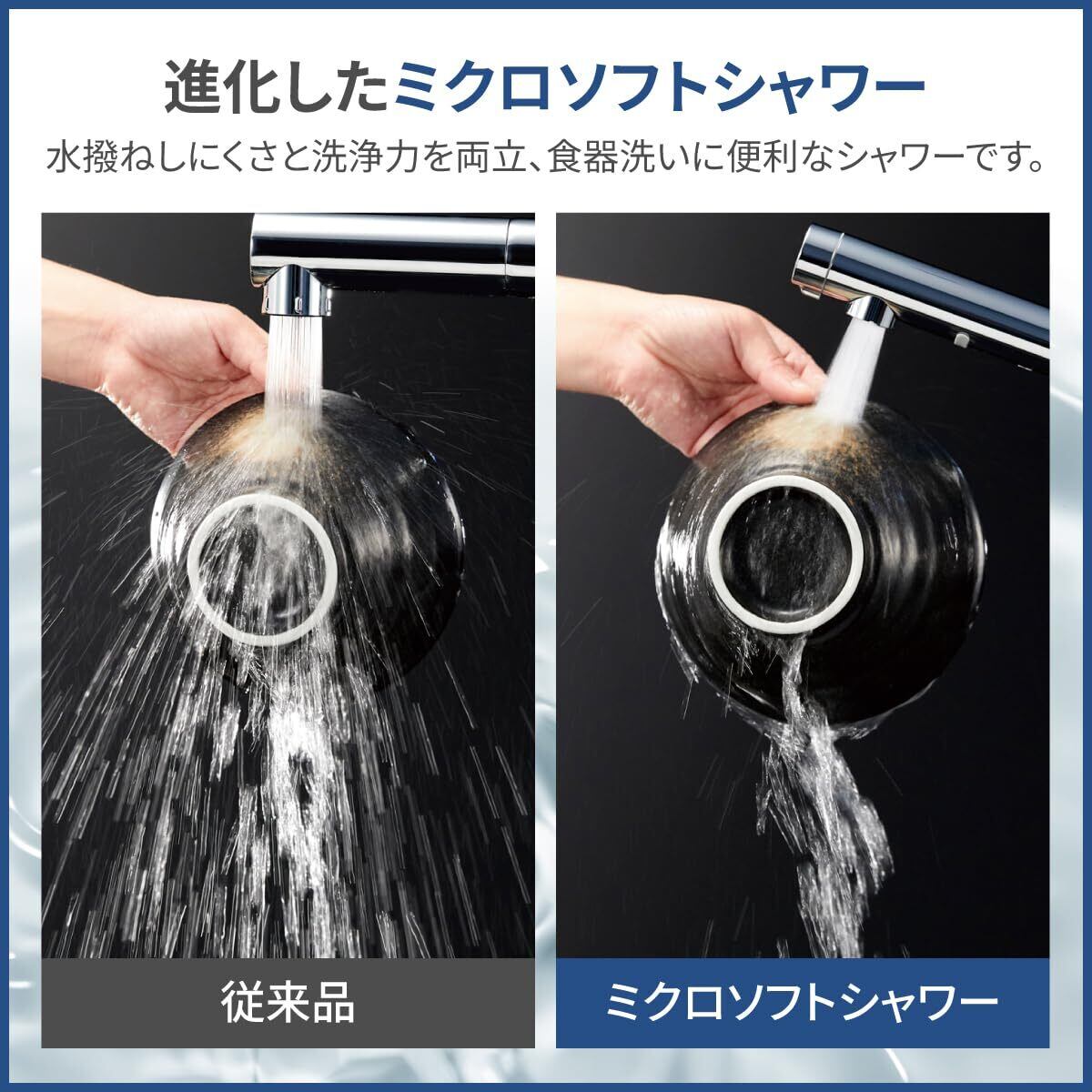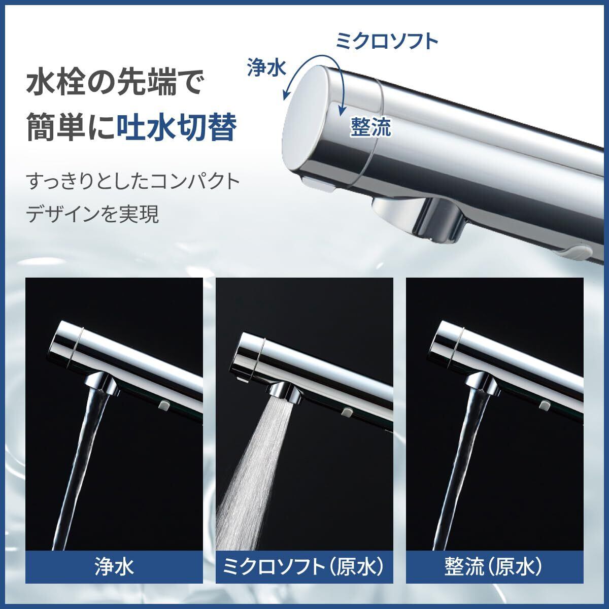ハンドシャワー引出しタイプ(ホース長450mm)、浄水・ミクロソフト・原水の切り替え可能、上面施工タイプ、エコシングル水栓