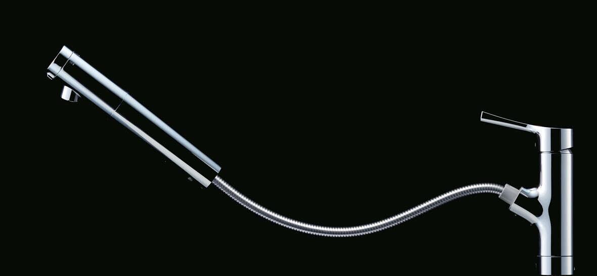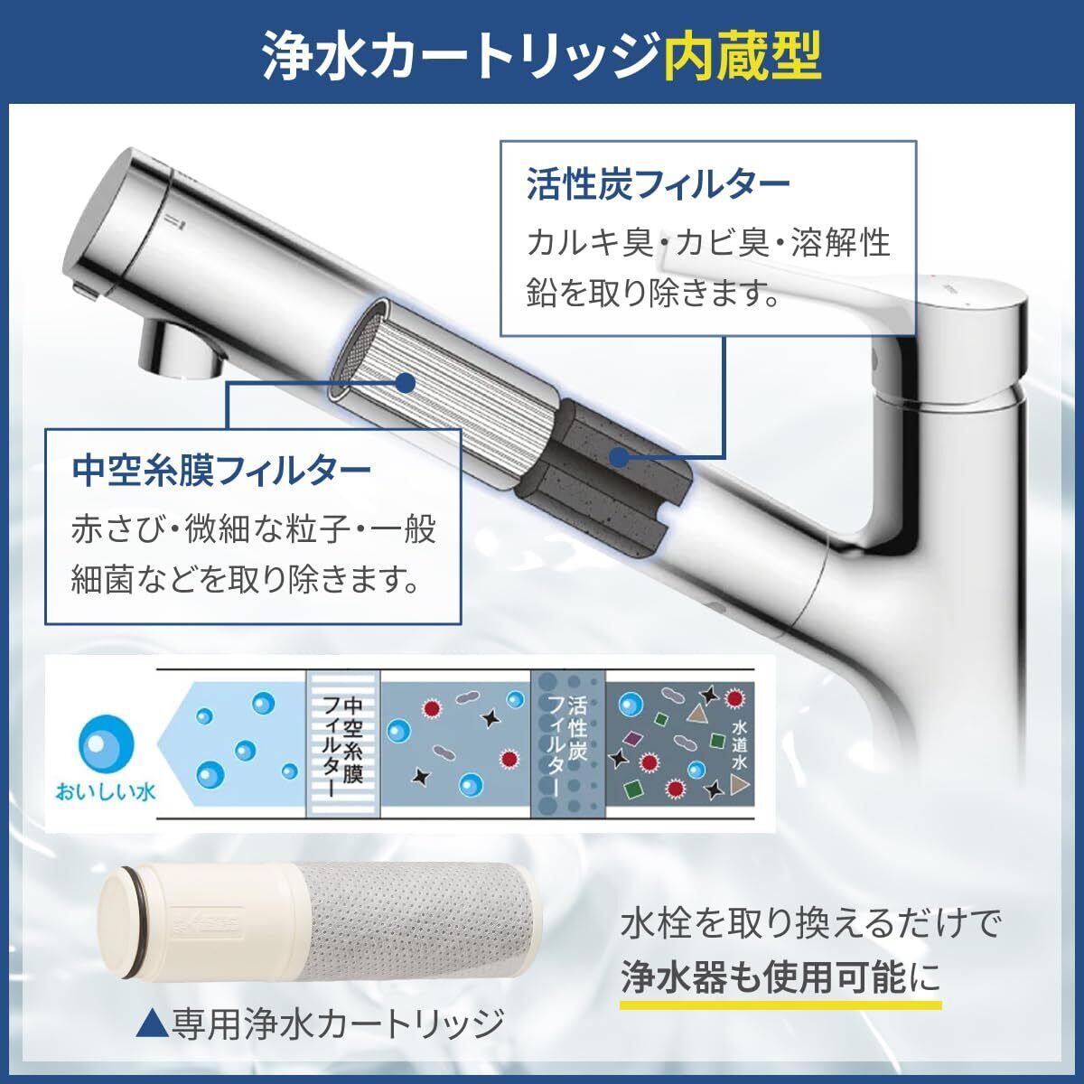 スリムなボディに高性能な小型浄水カートリッジを内蔵。便利なヘッド引出しタイプ。お湯の無駄使いを防ぐエコシングル機構を搭載